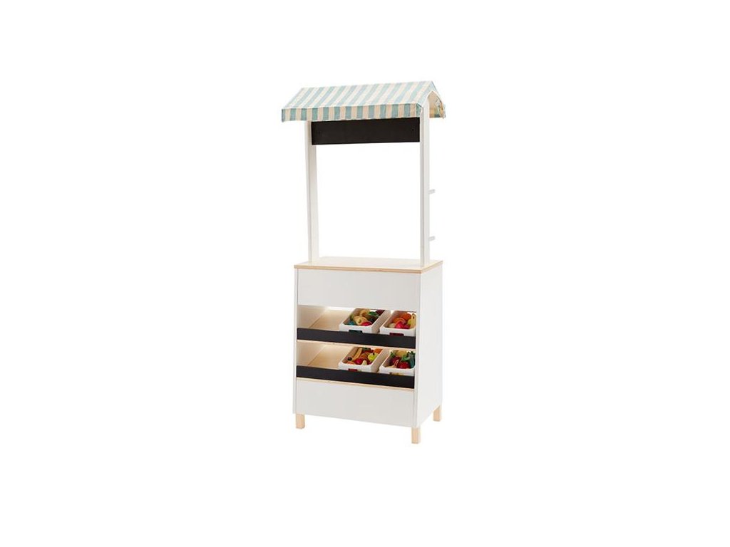 Dřevěný stánek, ze kterého si malý prodavač může vytvořit např. obchůdek se zmrzlinou či ovocem a zeleninou. Dvě velké police slouží pro vystavení zboží, popisovatelná tabule umožňuje vytvořit pokaždé nový, originální vývěsní štít. Dva háčky na boku stánku jsou určeny např. pro zavěšění nákupních tašek.