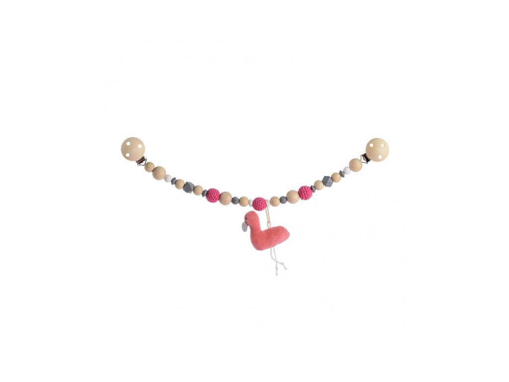 Dřevěné a textilní korálky spolu se zavěšenou hračkou plameňáka snadno připevíte na kočárek s pomocí klipů. Různorodé struktury korálků lákají dítě ke zkoumání.