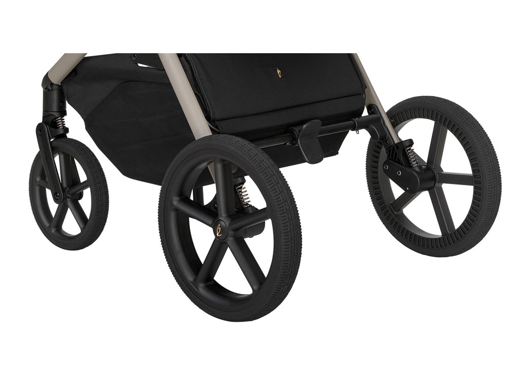 Při jízdě oceníte možnost výškového nastavení rukojeti do 5 pozic. Pohodlnou jízdu a snadné manévrování zajišťují velká kola, přední kola jsou otočná o 360° s možností aretace. Nechybí pružinové odpružení zadních i předních kol a spolehlivá "one touch" brzda.