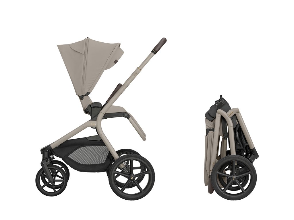 Po složení kočárek samostatně stojí. Pro snadné přenášení je připravený popruh přes rameno a madlo.