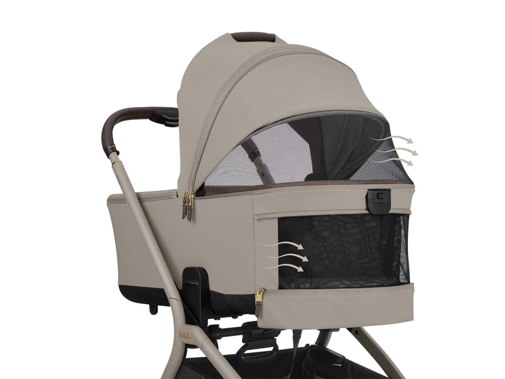 Pro pohodlí dítěte je součástí oboustranná měkká matrace se zimní stranou z kvalitního sametového materiálu a letní stranou z prodyšné síťoviny pro lepší ventilaci. Stříška má zipové prodloužení, sluneční clonu a doplňuje ji extra sluneční clona pro maximální stín. Ventilaci zajišťují síťované větrací otvory na stříšce i v oblasti hlavy. Praktická je i kapsa na telefon na zip. Voděodolný textilní materiál s UPF 50+ chrání dítě před povětrnostními vlivy a slunečním zářením.