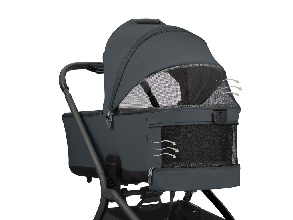 Pro pohodlí dítěte je součástí oboustranná měkká matrace se zimní stranou z kvalitního sametového materiálu a letní stranou z prodyšné síťoviny pro lepší ventilaci. Stříška má zipové prodloužení, sluneční clonu a doplňuje ji extra sluneční clona pro maximální stín. Ventilaci zajišťují síťované větrací otvory na stříšce i v oblasti hlavy. Praktická je i kapsa na telefon na zip. Voděodolný textilní materiál s UPF 50+ chrání dítě před povětrnostními vlivy a slunečním zářením.