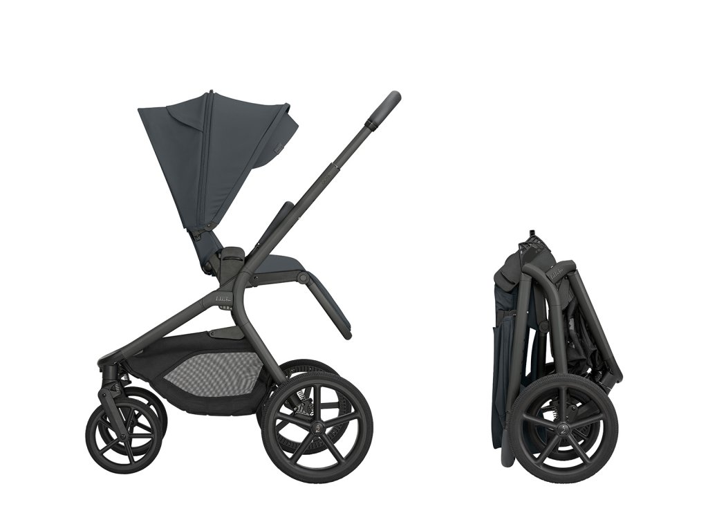 Po složení kočárek samostatně stojí. Pro snadné přenášení je připravený popruh přes rameno a madlo.