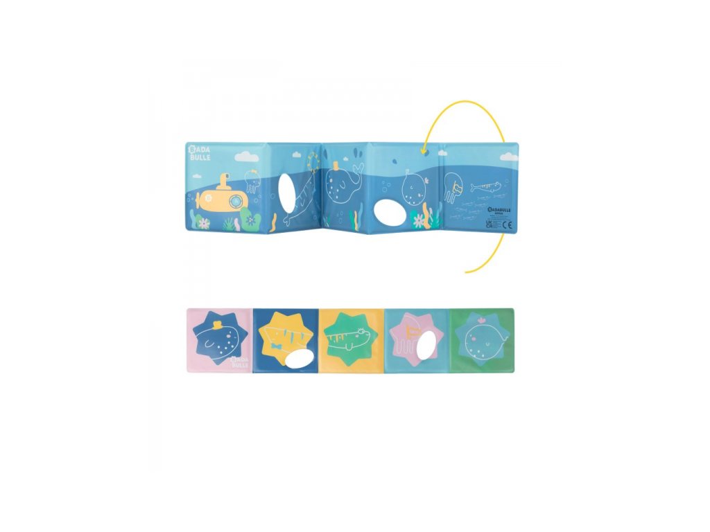 sada obsahuje: rozkládací knížku/leporelo + prstového maňáska + 20ks pěnových puzzle, které plavou na vodě a drží na stěnách vany či sprchového koutu