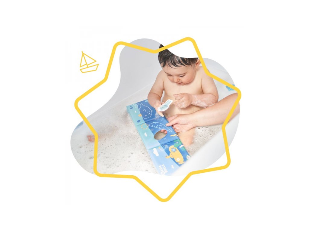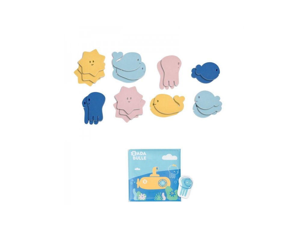 - sada obsahuje: rozkládací knížku/leporelo + prstového maňáska + 20ks pěnových puzzle, které plavou na vodě a drží na stěnách vany či sprchového koutu