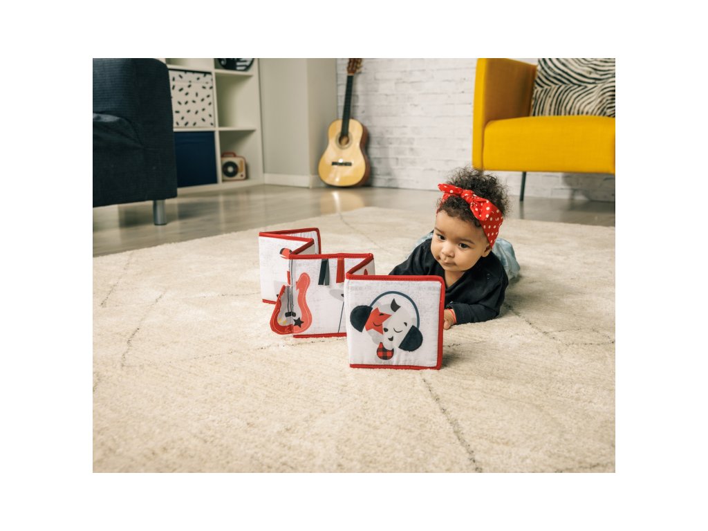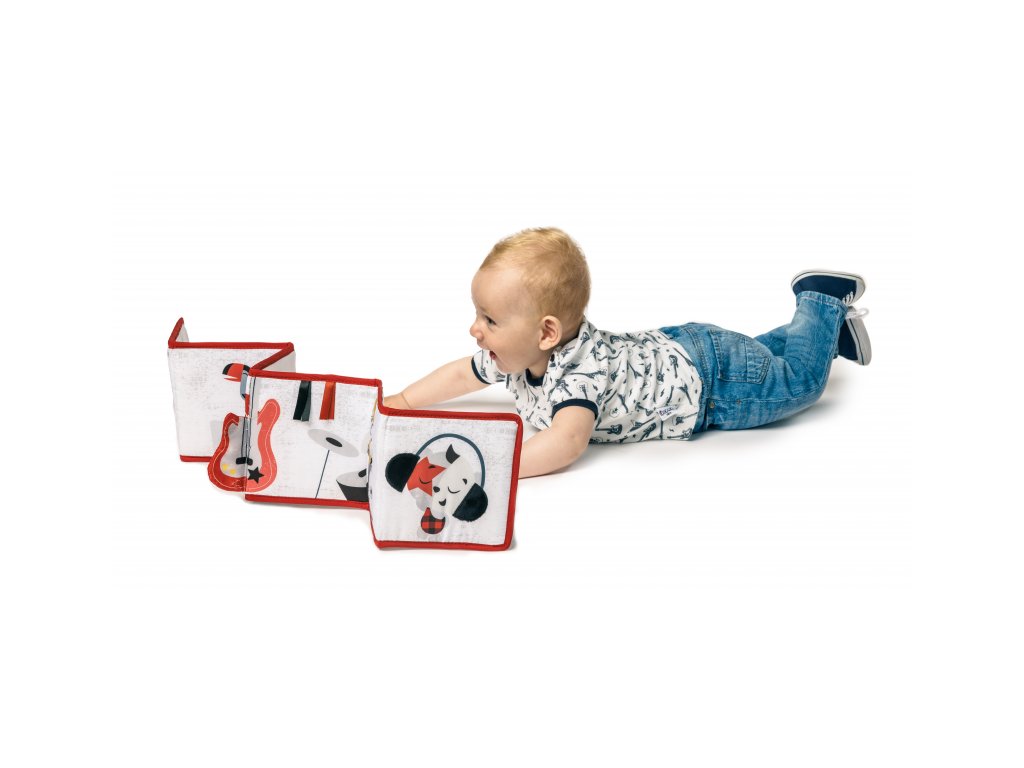 - Od 3 měsíců: strana s barevnými obrázky a různorodými texturami ke zkoumání, které podporují rozvoj smyslů a jemné motoriky dítěte.