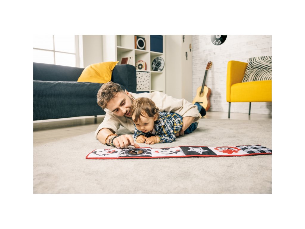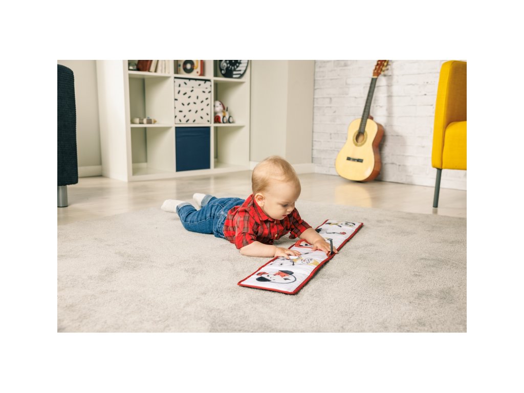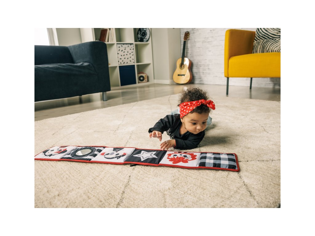- 0-3 měsíce: strana s bezpečným zrcátkem a vysoce kontrastními, jednoduchými obrázky v základních barvách, které podněcují rozvoj smyslů a emoční inteligence dítěte.