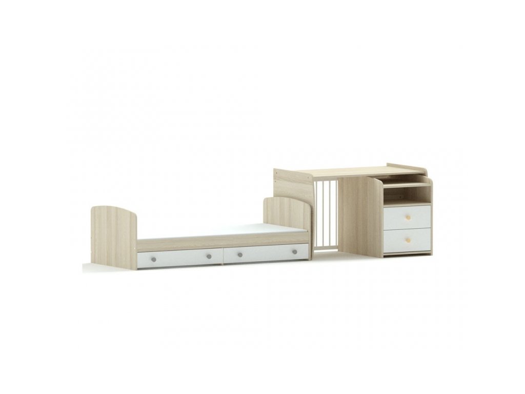 Později se může postýlka přestavět na válendu o rozměrech 180 x 80 cm (se 2 kontejnery) a na psací stůl (š. 124 cm, hl. 80 cm, v. 74 cm).