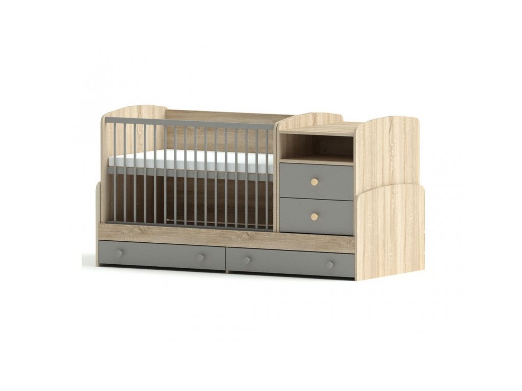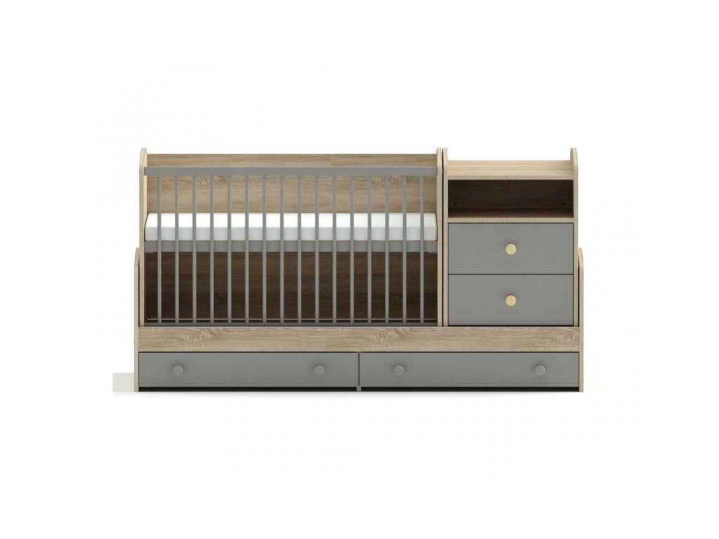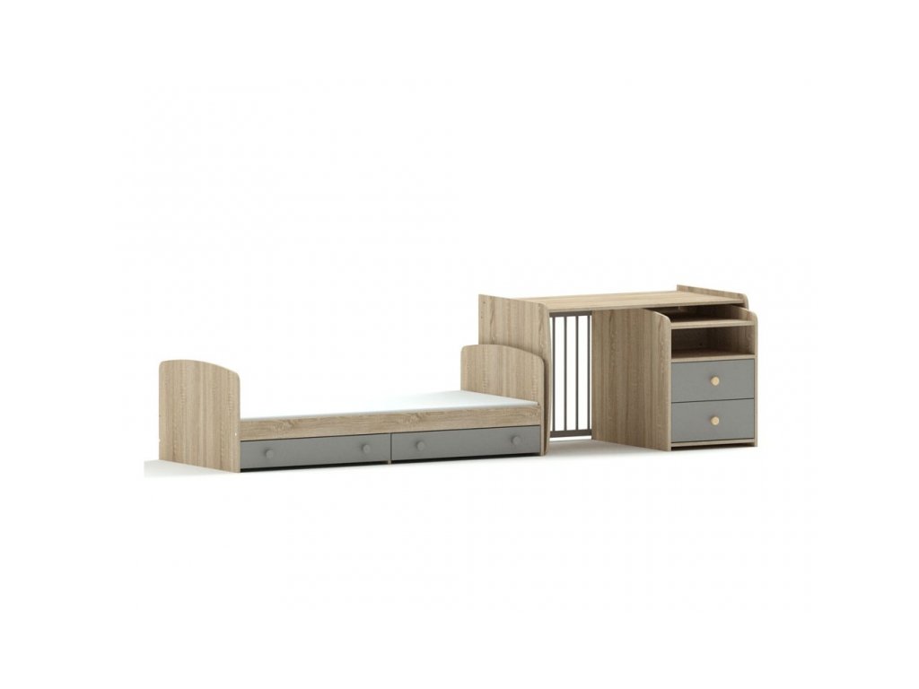 I když se na první pohled zdá být kombi postel robustní, opak je pravdou. Vždyť na 2 metrech máte vše, co jindy zabírá mnohem více prostoru – postýlku i přebalovací komodu. Toto řešení doporučujeme pro menší dětské pokoje. Univerzálnost sestavy tkví v její rozložitelnosti na jednotlivé kusy nábytku.