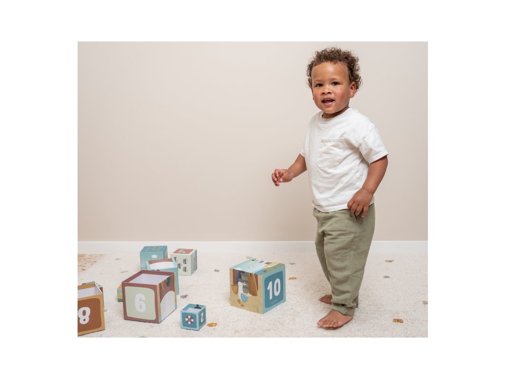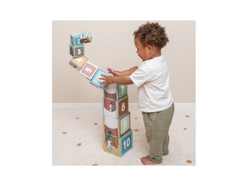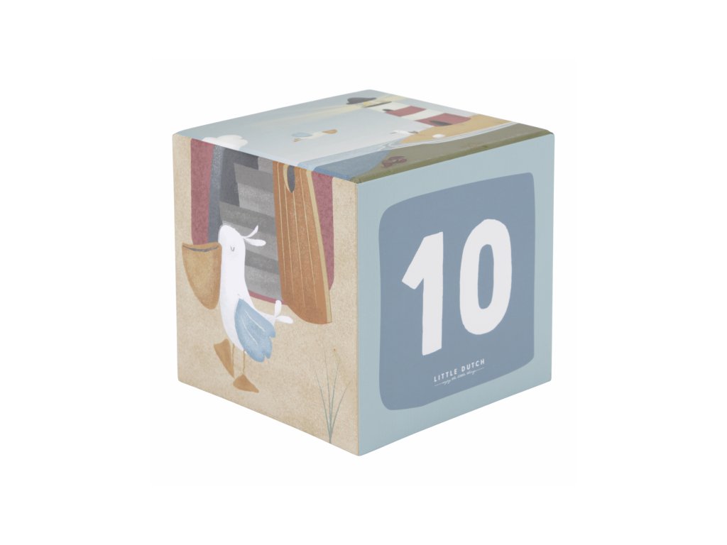 Barevné kartonové kostky s krásnými ilustracemi ze života na moři. Nechte vaše dítě kostky skládat na sebe do vysoké věže nebo vedle sebe podle velikosti. Ve starším věku se dítě s pomocí očíslovaných kostek může hravým způsobem učit počítat i rozpoznávat číslice.
