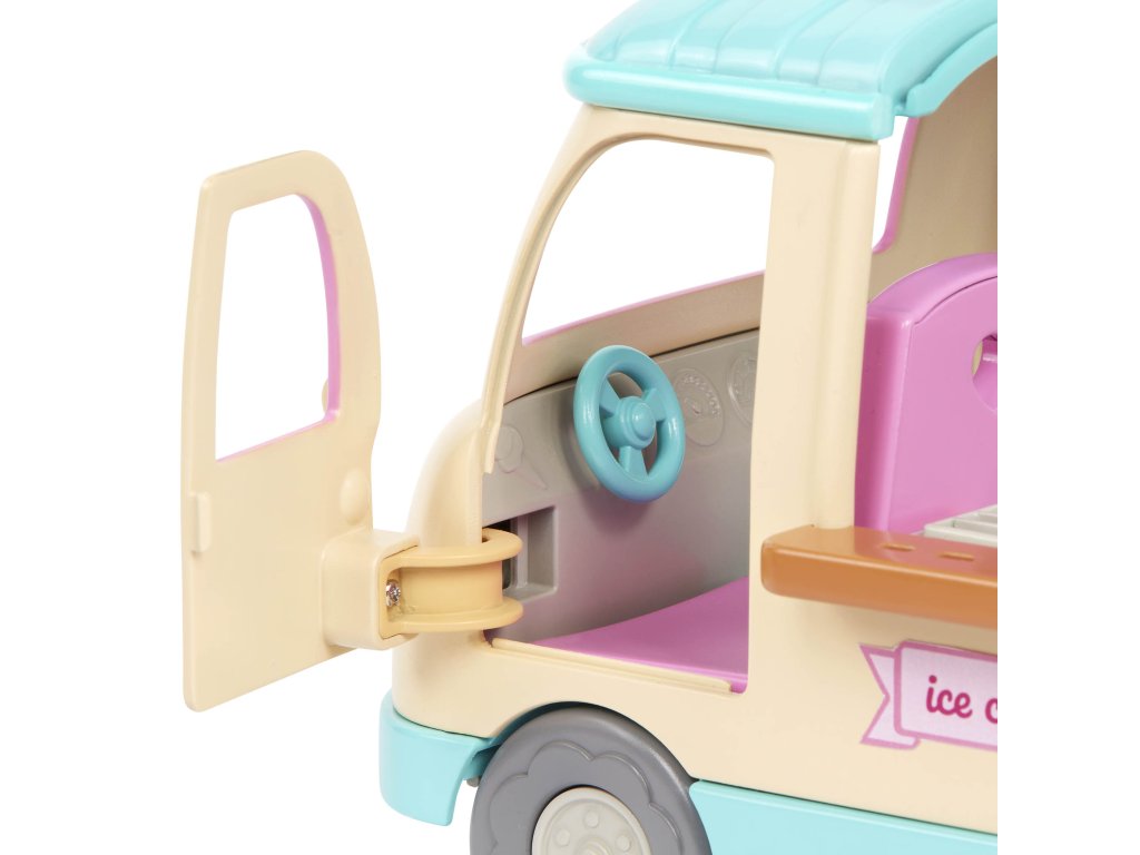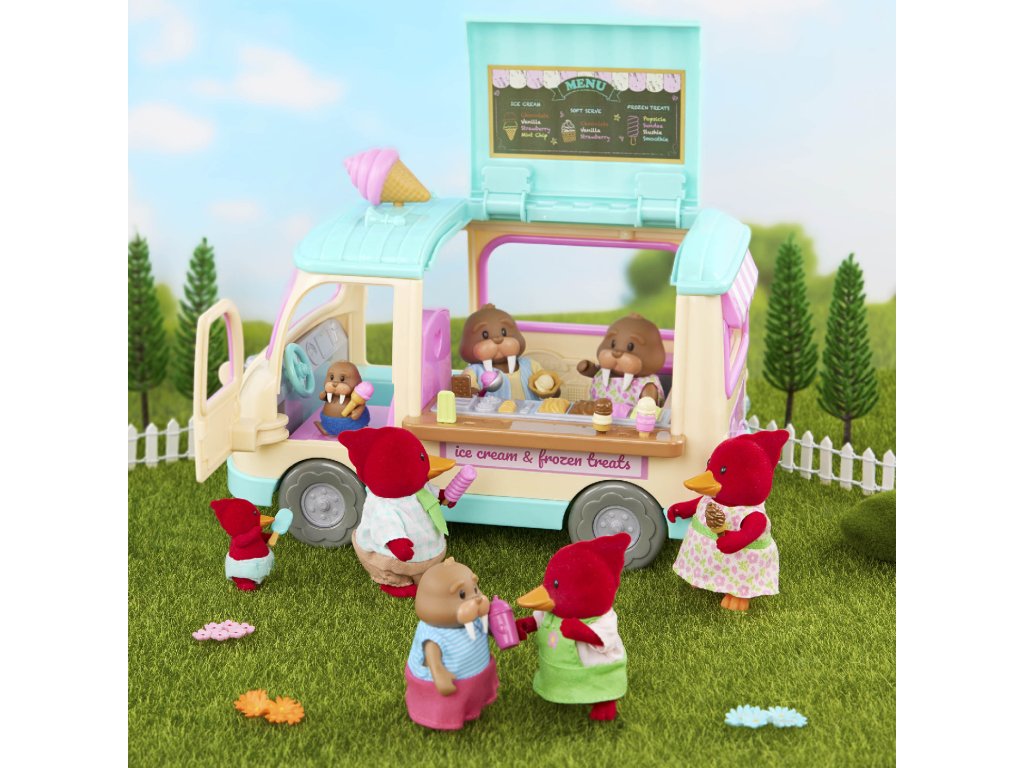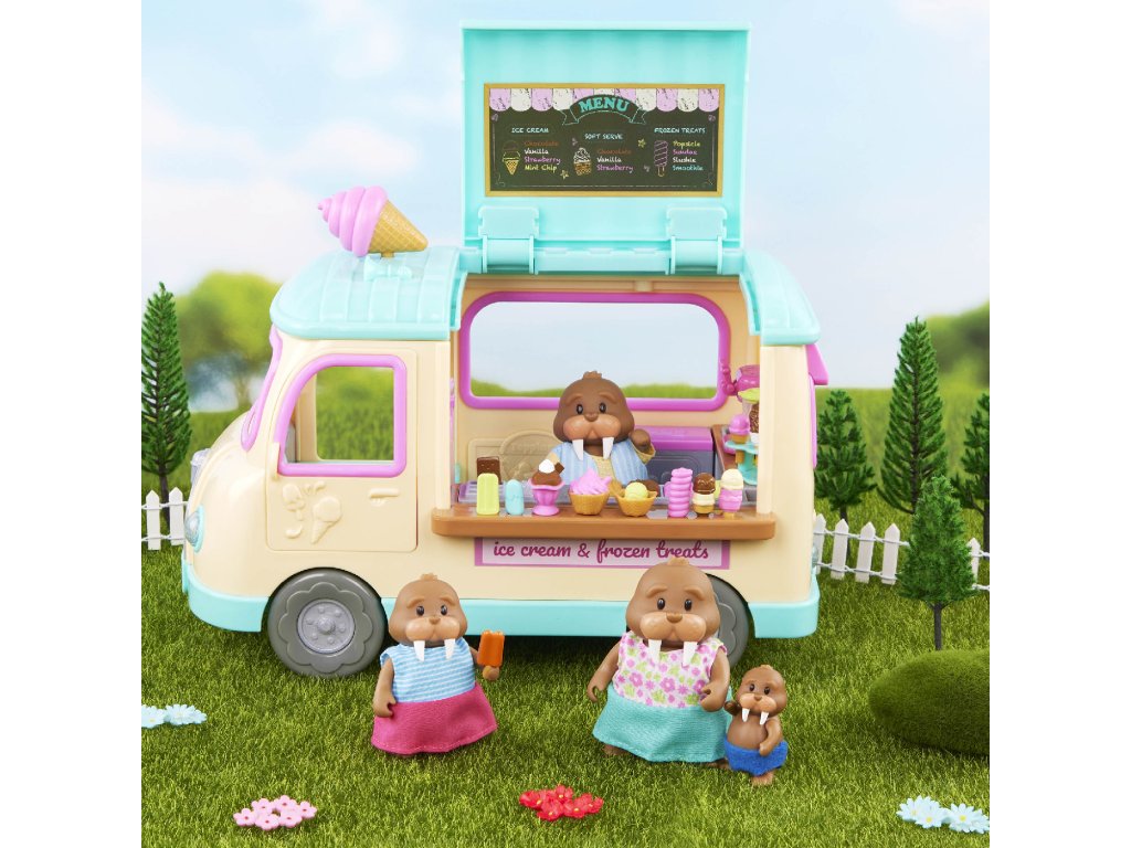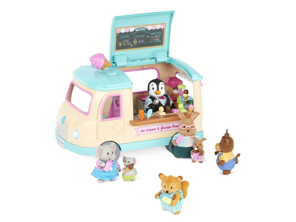 Dodávka se zmrzlinou přiváží obyvatelům městečka Honeysuckle Hollow každý letní den zmrzlinu, nanuky i mléčné koktejly vlastní výroby. Až budete vjíždět do městečka, nezapomeňte zmáčknout volant, kterým se rozsvítí světla a ozve se zvuk, aby všichni vědělí, že jedete! Postavičky zvířátek nejsou součástí balení, prodávají se samostatně.