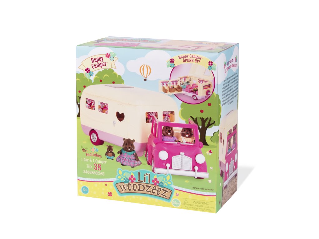 Sada na kempování Happy Camper obsahuje vše, co rodina z městečka Honeysuckle Hollow může potřebovat na výlet do přírody. Obytný přívěs nabízí pohodlné spaní i prostor pro vaření a stolování. Stačí jen vybrat rodinku ze samostatně prodávaných postaviček zvířátek Li'l Woodzeez, posadit ji do auta a dovolená v přírodě může začít!