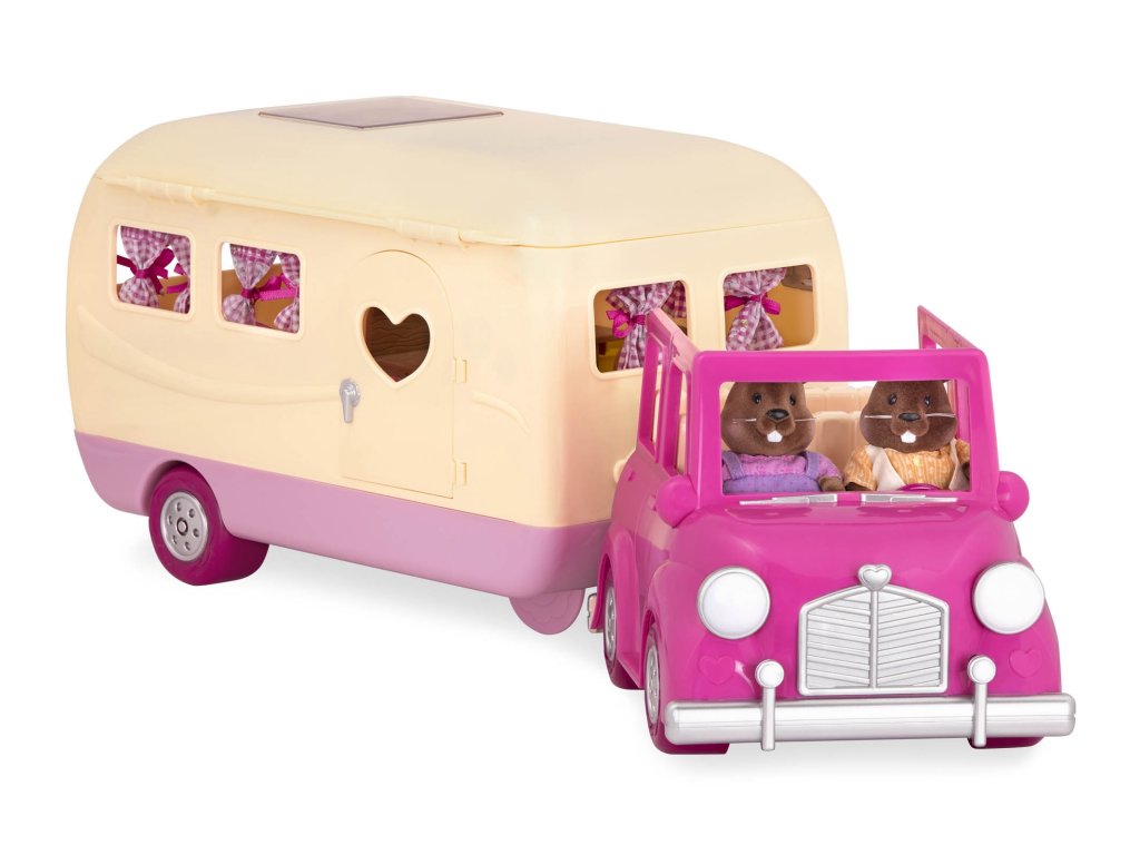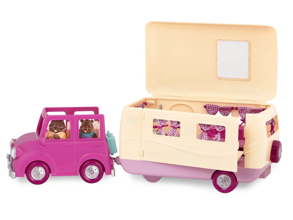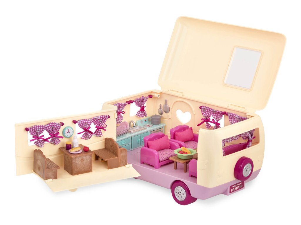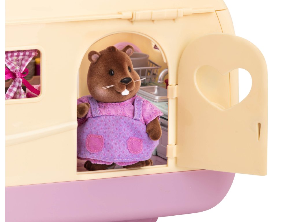 Sada na kempování Happy Camper obsahuje vše, co rodina z městečka Honeysuckle Hollow může potřebovat na výlet do přírody. Obytný přívěs nabízí pohodlné spaní i prostor pro vaření a stolování.
