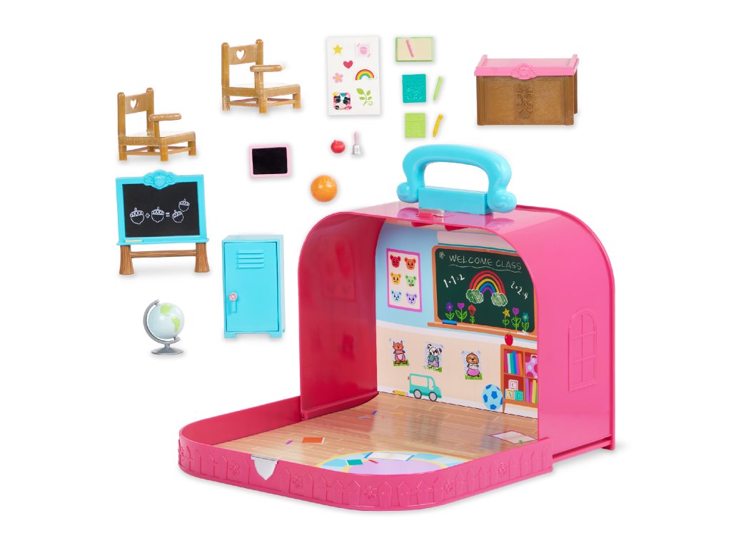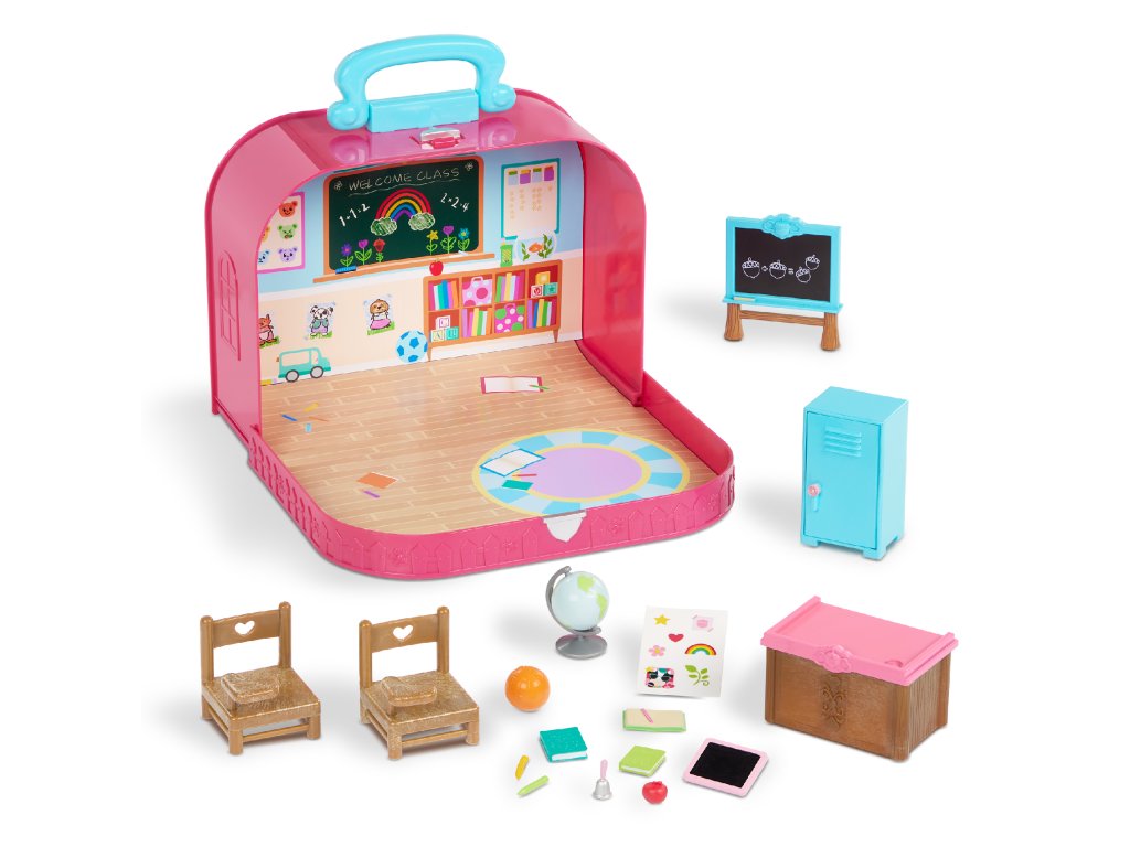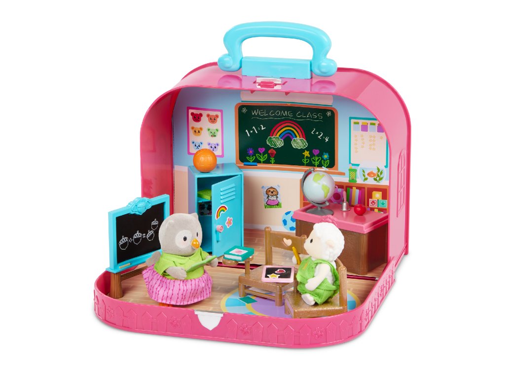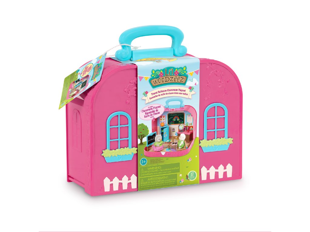 Cestovní sada hraček Li'l Woodzeeze v praktickém kufříku umožní vašemu dítěti hrát si se kdekoli na dovolené, výletech či během víkendu u prarodičů. Kufřík se po otevření promění v bohatě vybavenou školní třídu s nábytkem a doplňky.