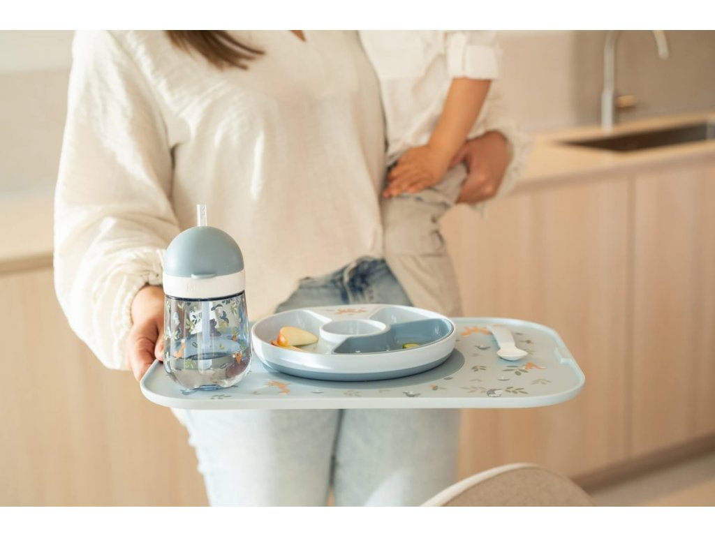 Dětský talíř s krásným potiskem má protiskluzové dno a vysoký okraj, který pomáhá dítěti jídlo nabrat na lžíci. Talíř je tak ideální pro první samostatné stolování dítěte.