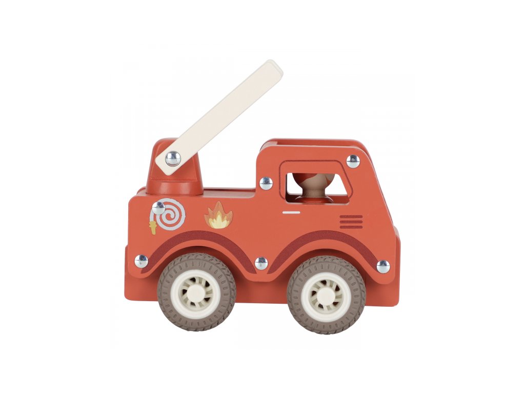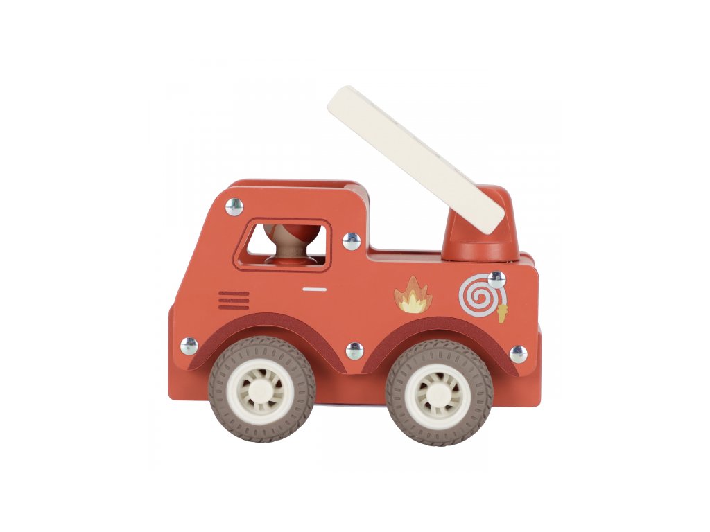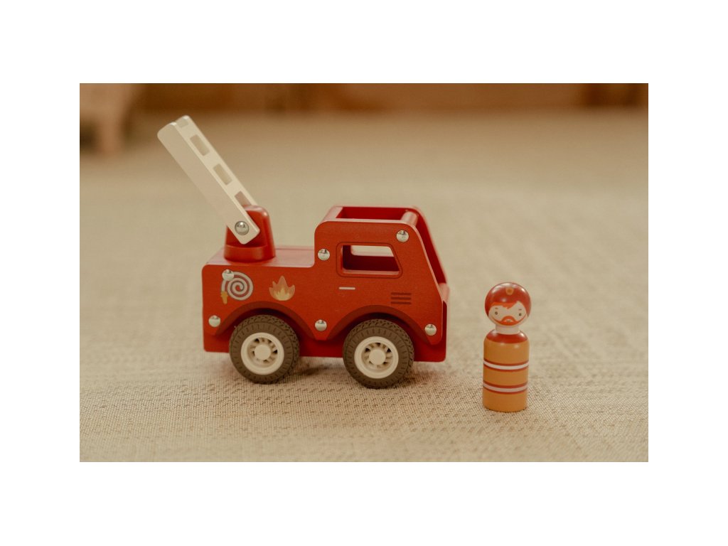 S tímto dřevěným hasičským autem budete vždy připraveni vyrazit do akce! Vozidlo je vybaveno výsuvným žebříkem a odvážným hasičem v podobě dřevěné figurky.