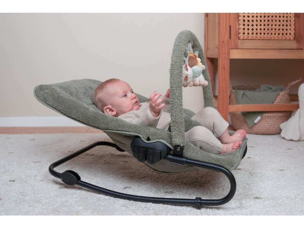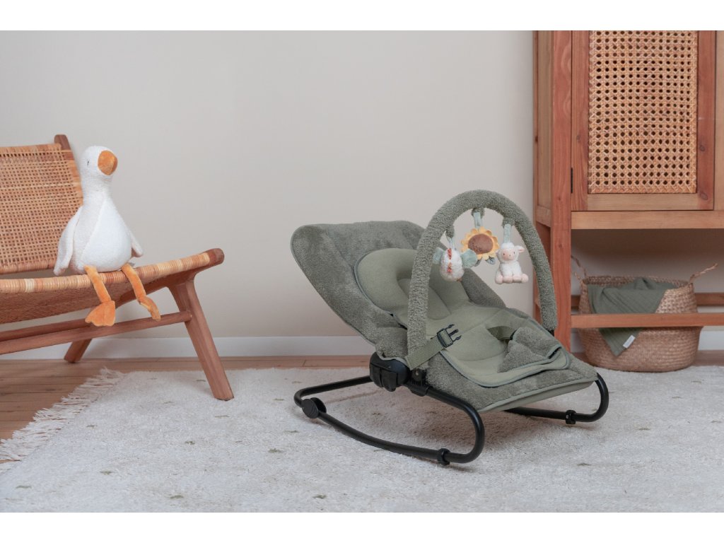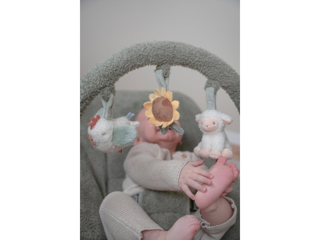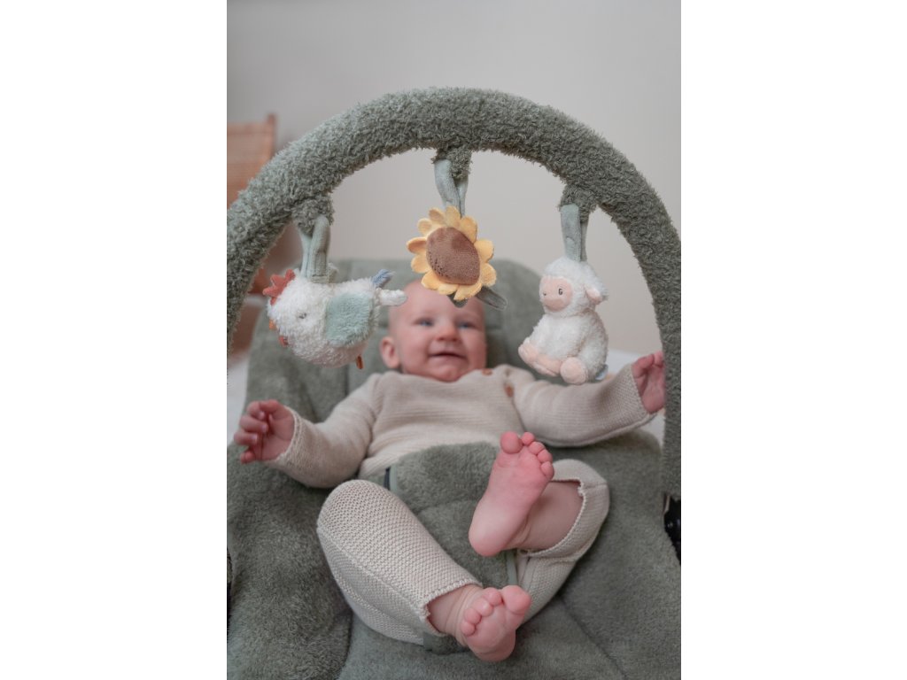 Houpací lehátko Little Dutch s hrazdou poskytne vašemu dítě pohodlné místo k odpočinku i hraní. Pozornost dítěte upoutají tři zavěšené plyšové hračky v podobě slepičky, kytičky a ovečky.