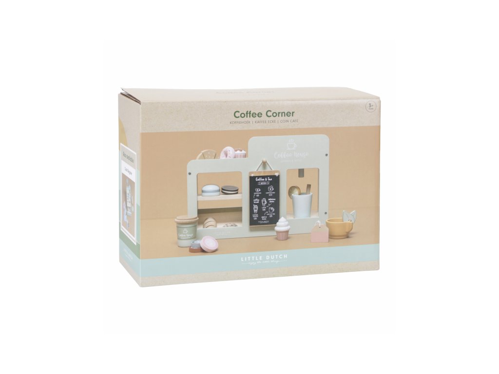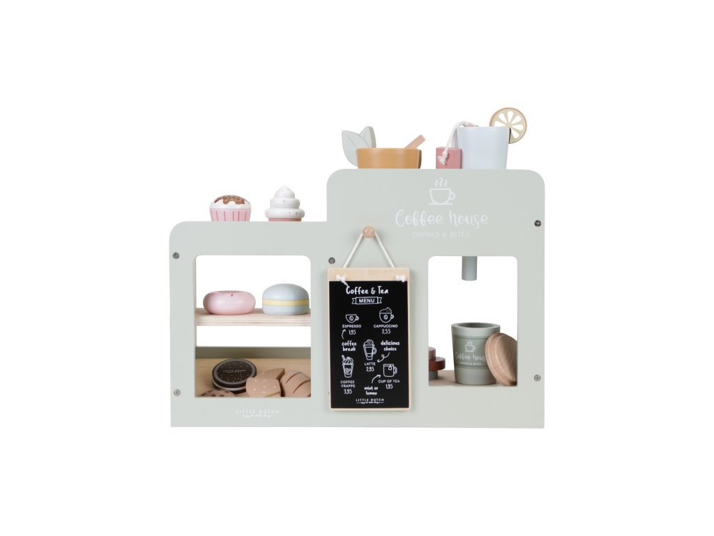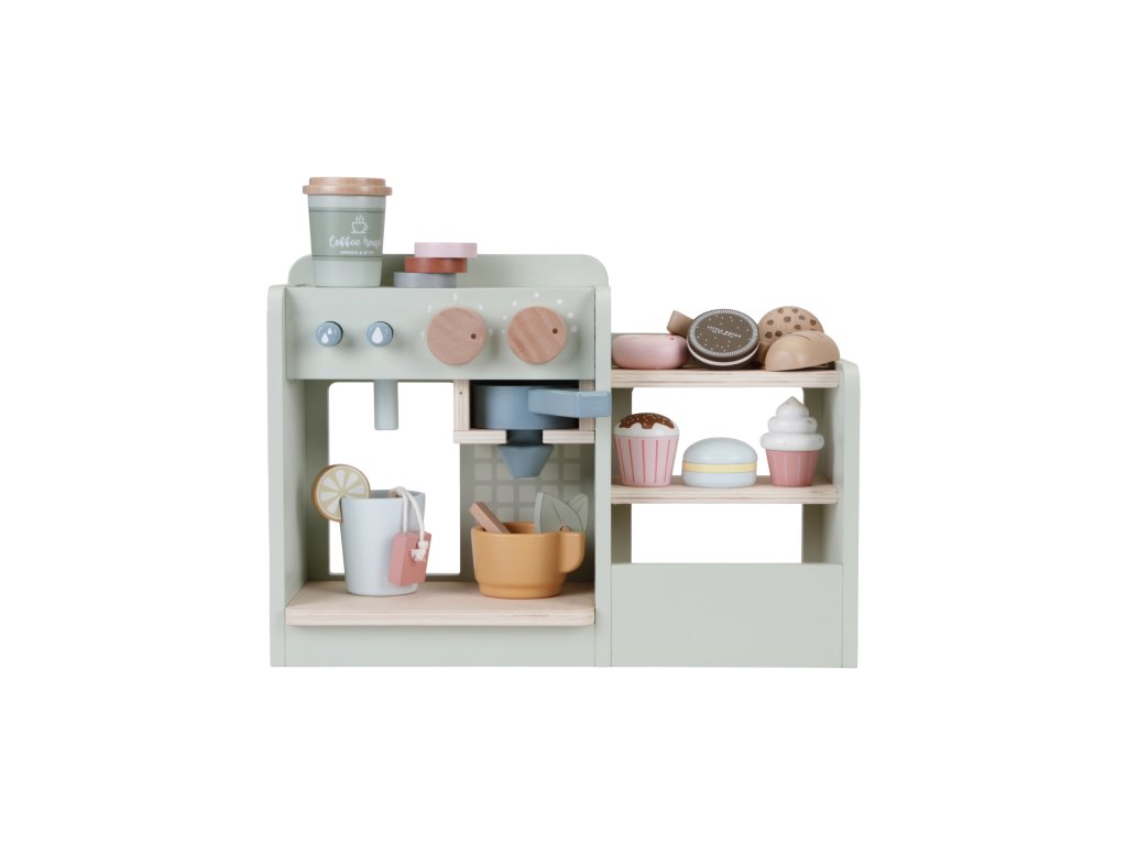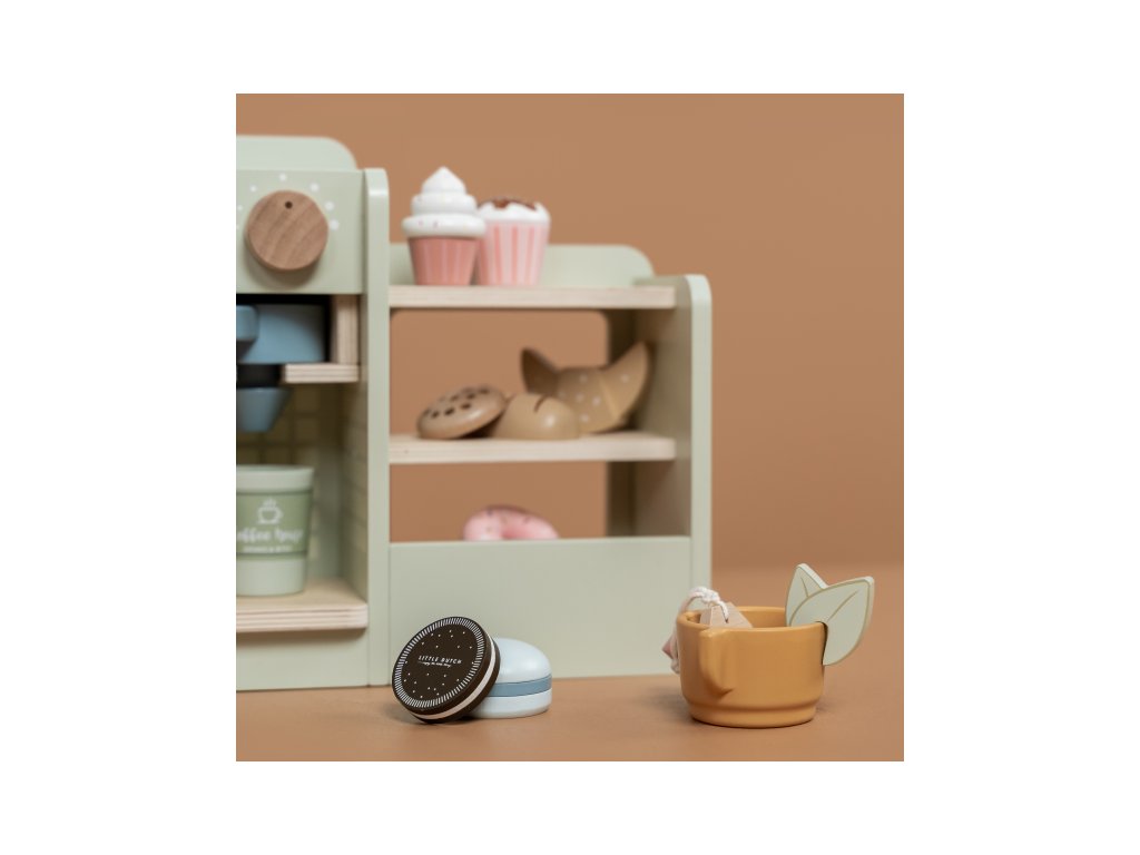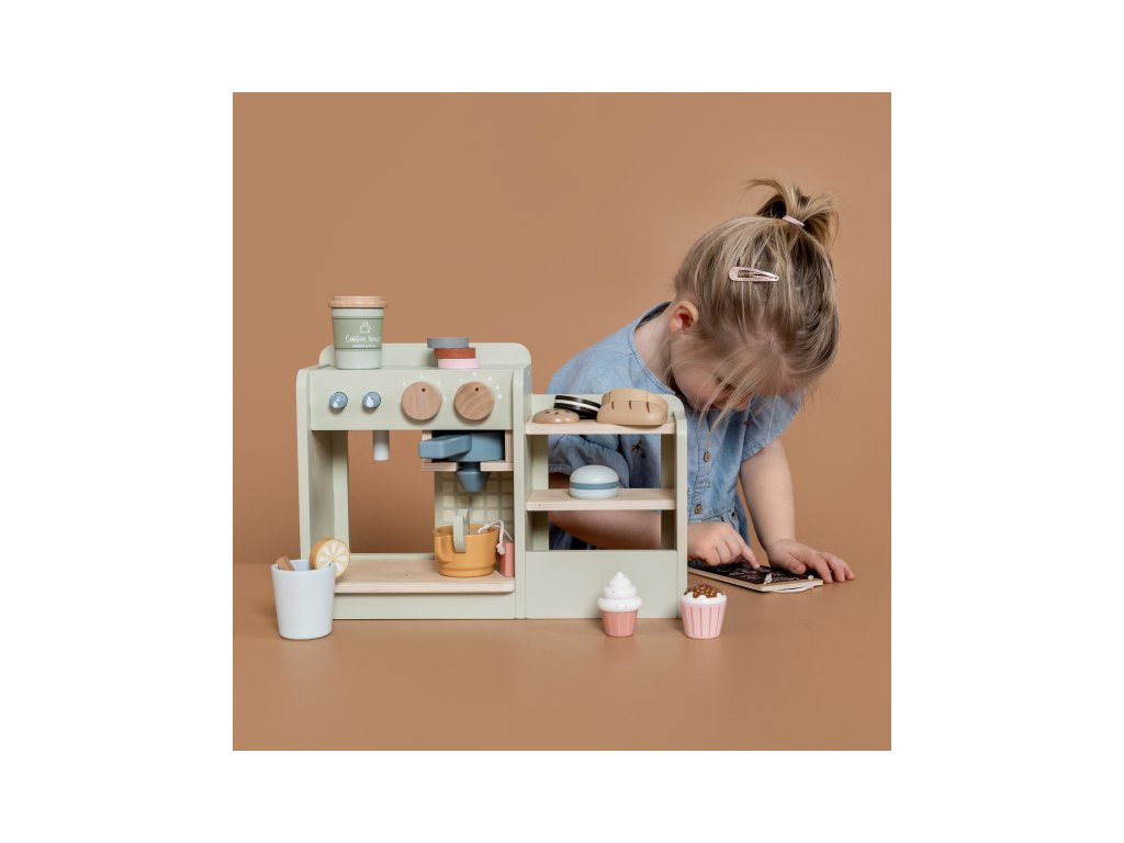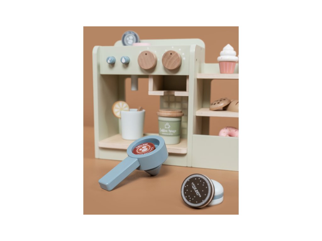 Dáte si kávu nebo čaj? S tímto dřevěným kávovarem s bohatým příslušenstvím si může vaše dítě otevřít doma vlastní kavárnu a pozvat vás na cappuccino či espresso spolu s dortíkem, koláčkem či sendvičem. Pro přípravu kávy stačí otočit knoflíkem, zmáčknout tlačítko a káva je hotová! Poličky s vystavenými zákusky lákají k ochutnání, nápojový lístek vám usnadní objednávání nápojů.