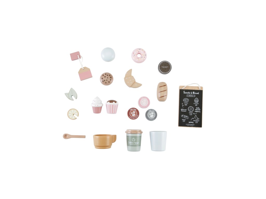 Součástí sady jsou hrnečky, talířky, kávové kapsle, čajový sáček, croissant, donut, cupcake, muffin a mnoho dalších doplňků pro servírování občerstvení.