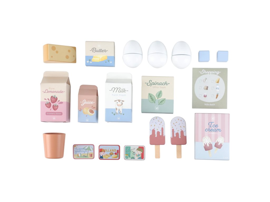 Součástí balení je 19 doplňků, které se hodí pro uložení do lednice: máslo, sýr, 3 vejce, 2 kostky ledu, limonáda, džus, mléko, mražený ěpenát, 3 zmrzliny, kelímek, 3 magnety na lednici a nákupní seznam.