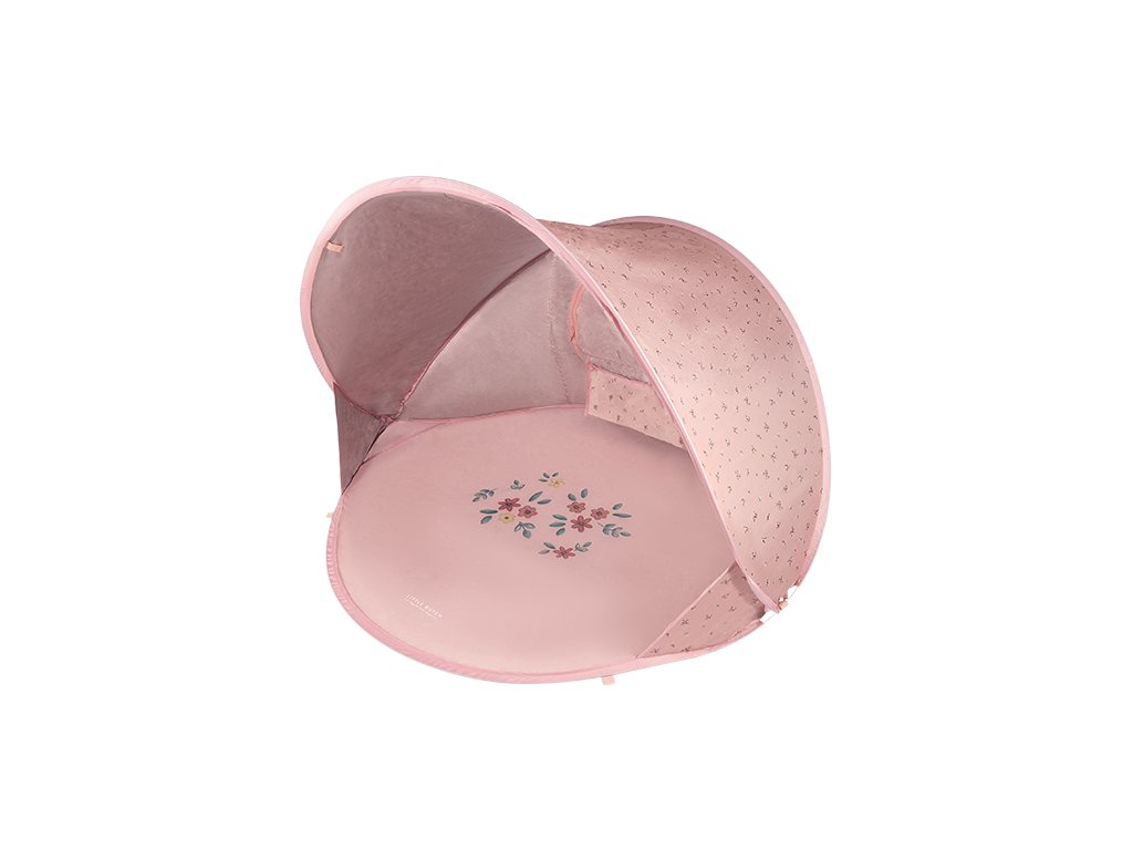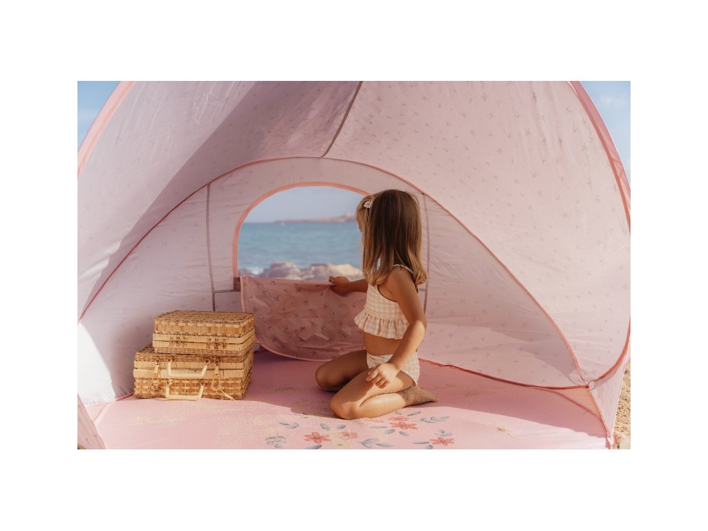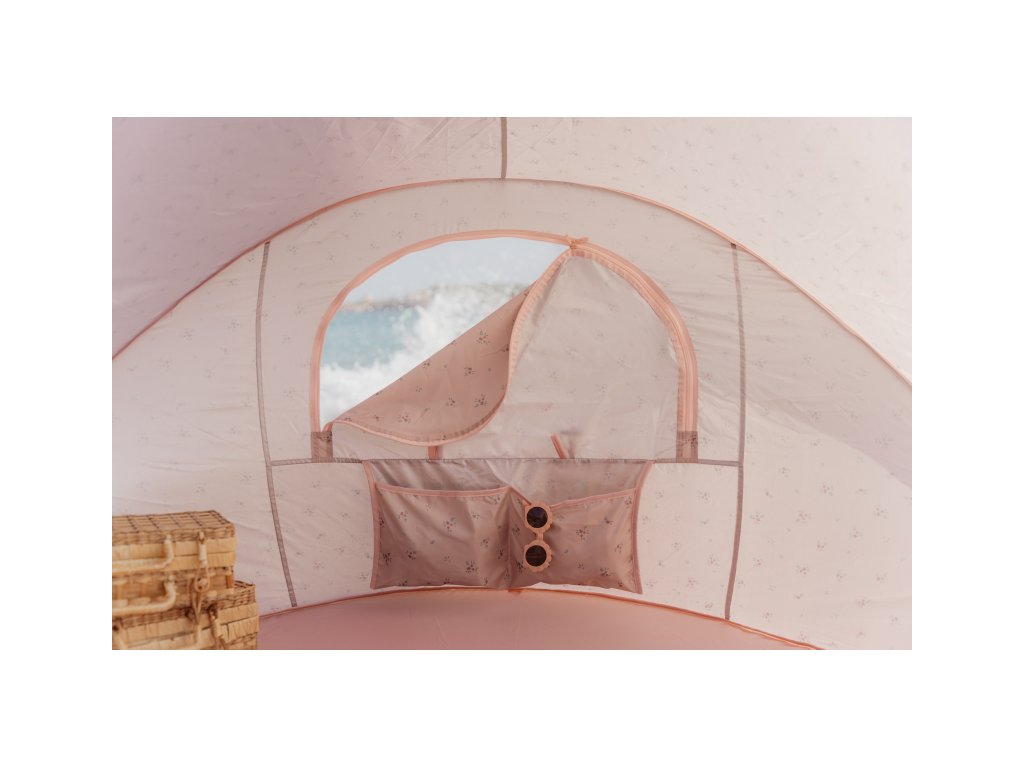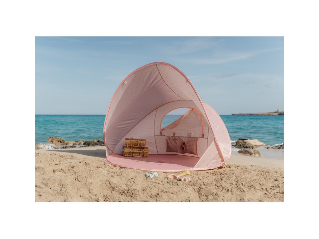 Přenosný skládací stan s UV faktorem 40+ pro ochranu dítěte před sluncem na zahradě, na pláži či na výletech do přírody. Stan umožňuje snadnou ventilaci díky zadnímu okénku na zip. Dvě kapsy na vnitřní stěně nabízí prostor pro uložení drobností.