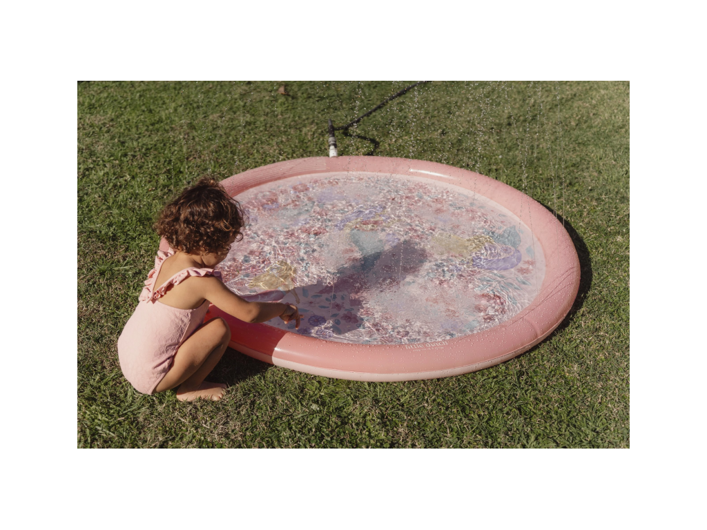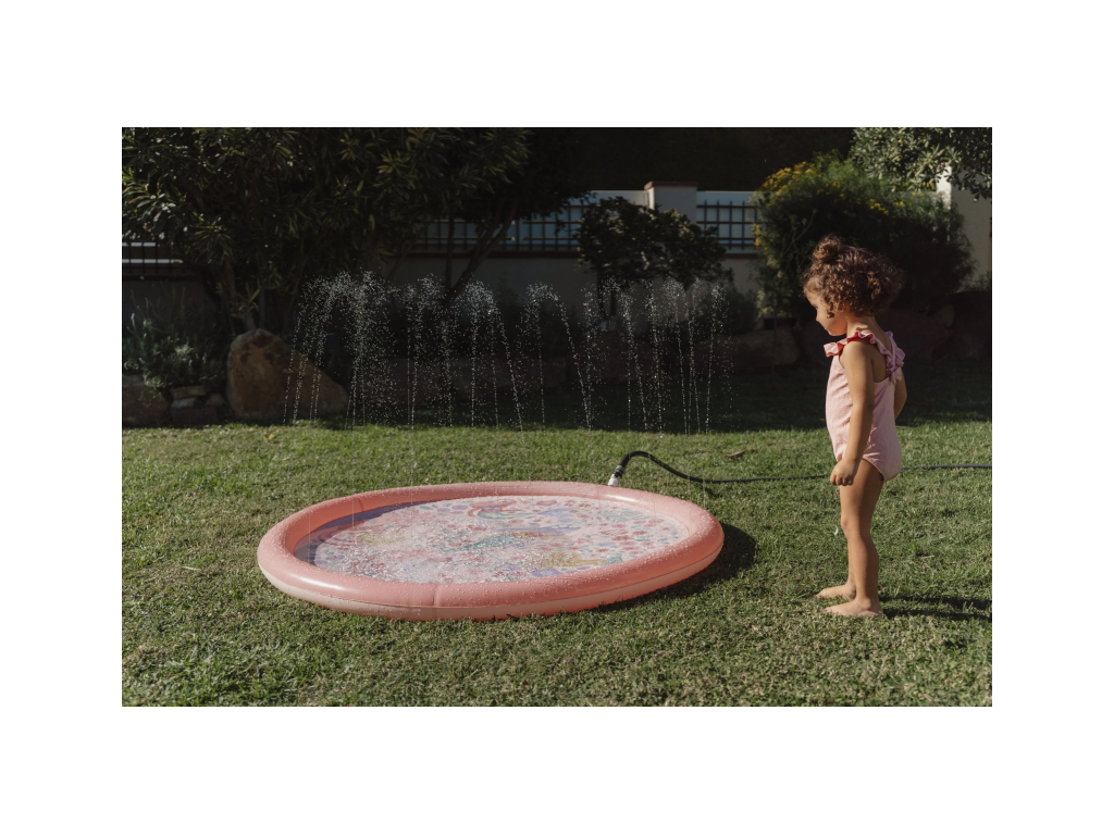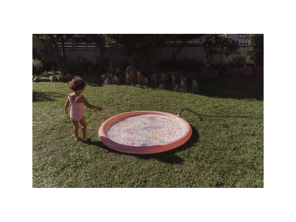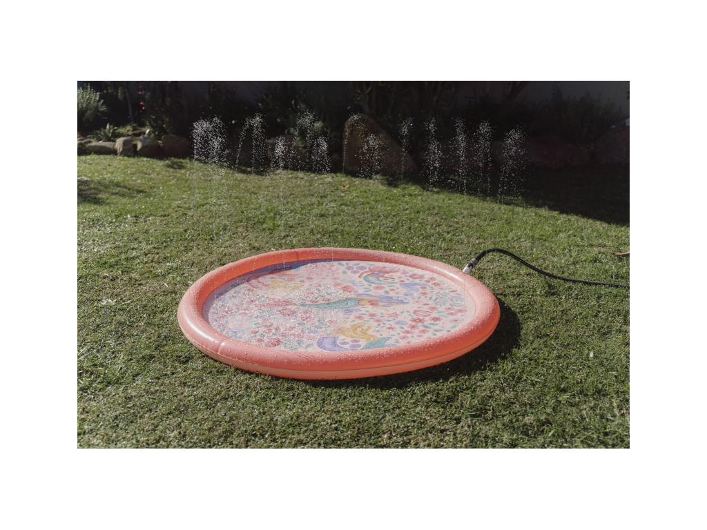 Originální hrací podložka s vodotryskem, který vytvoříte jednoduše připojením na zahradní hadici s pomocí přiložené spojky. Podložka s krásným potiskem motivů ze života mořské víly a květin je ideální doplněk na zahradu během horkých letních dní. Děti si budou užívat běhání přes stříkající vodotrysk i hraní si s vodou na podložce, která funguje jako mělký bazének.