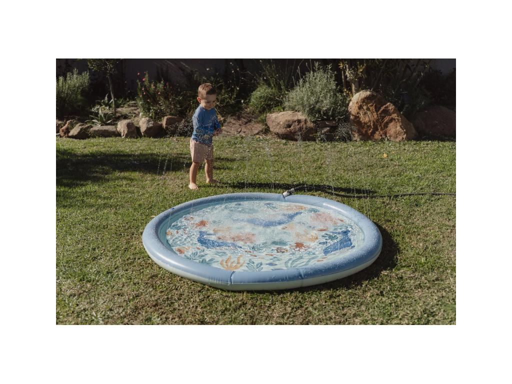Originální hrací podložka s vodotryskem, který vytvoříte jednoduše připojením na zahradní hadici s pomocí přiložené spojky. Podložka s krásným potiskem motivů ze života pod mořskou hladinou je ideální doplněk na zahradu během horkých letních dní. Děti si budou užívat běhání přes stříkající vodotrysk i hraní si s vodou na podložce, která funguje jako mělký bazének.