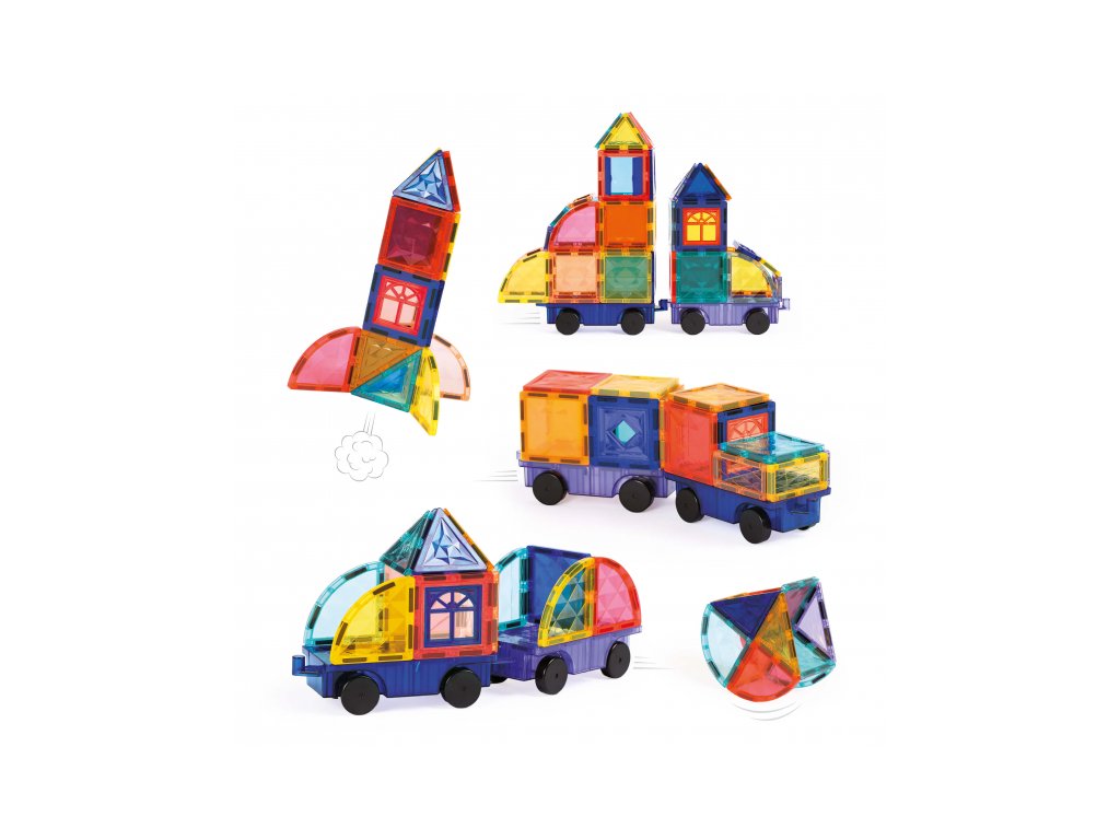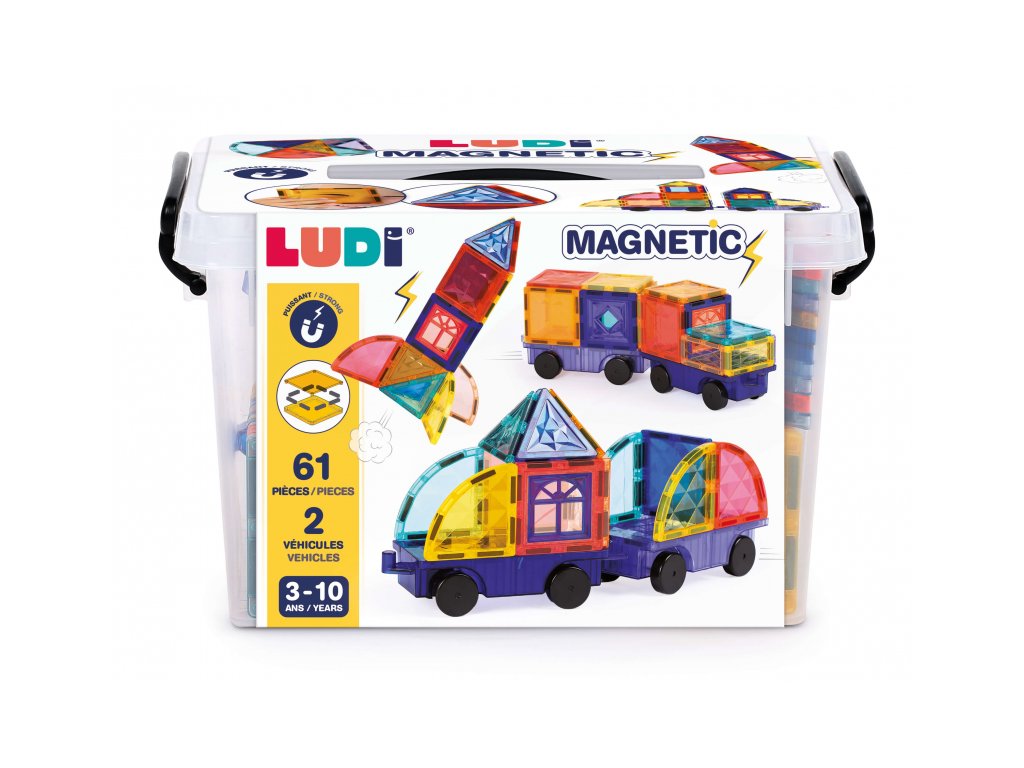 Objevte svět plný pohybu a fantazie s magnetickou stavebnicí Ludi! Praktický plastový box s držadlem ukrývá 63 magnetických dílků, mezi nimiž jsou i 2 podvozky s kolečky, díky kterým mohou děti stavět vlastní auta, náklaďáky nebo