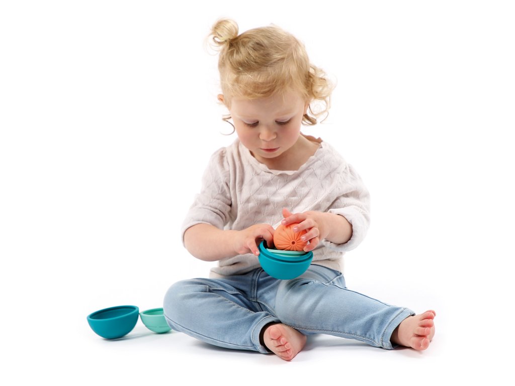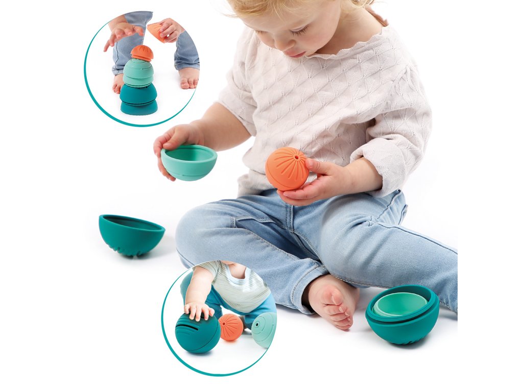 - Jakmile se dítě naučí sedět, může míčky stavět na sebe a vkládat je do sebe jako ruské panenky