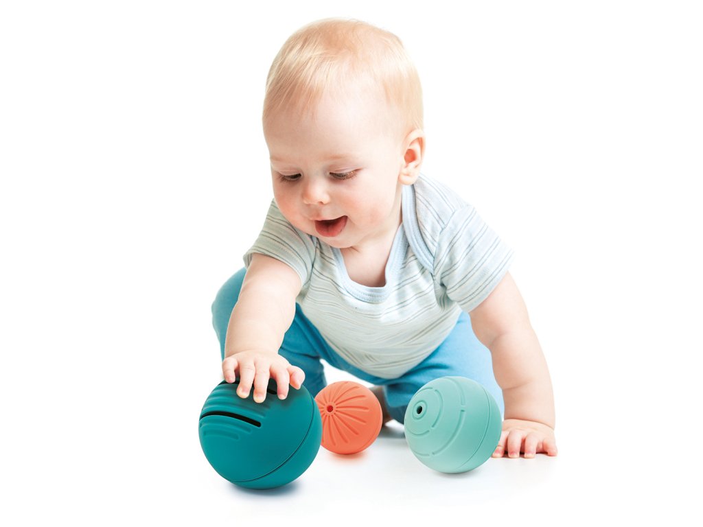 Sada tří měkkých silikonových míčků je ideálním pomocníkem pro rozvoj motoriky a smyslů už od útlého věku. Díky různým velikostem a texturám roste s dítětem a přináší pokaždé nové možnosti hry.