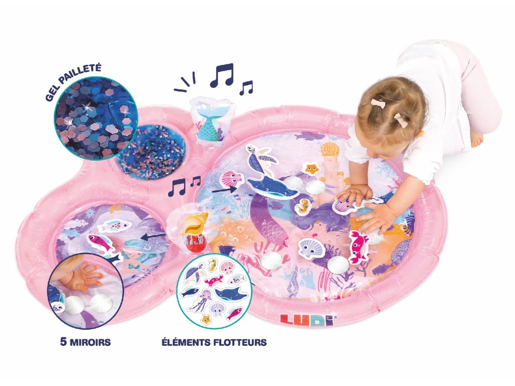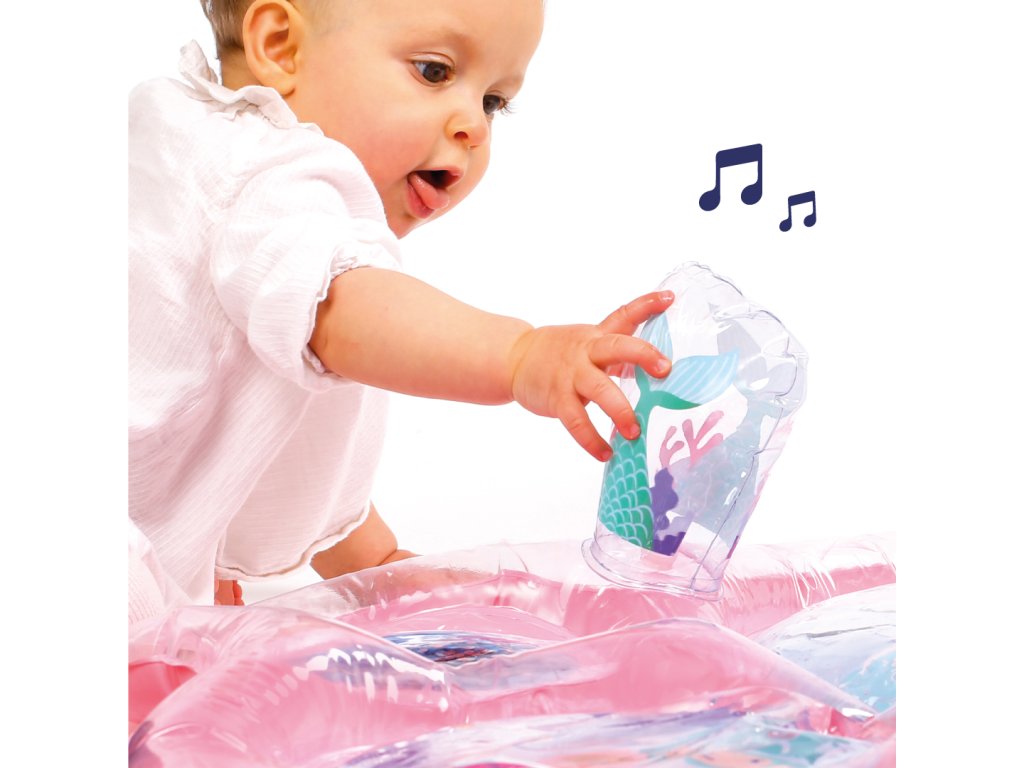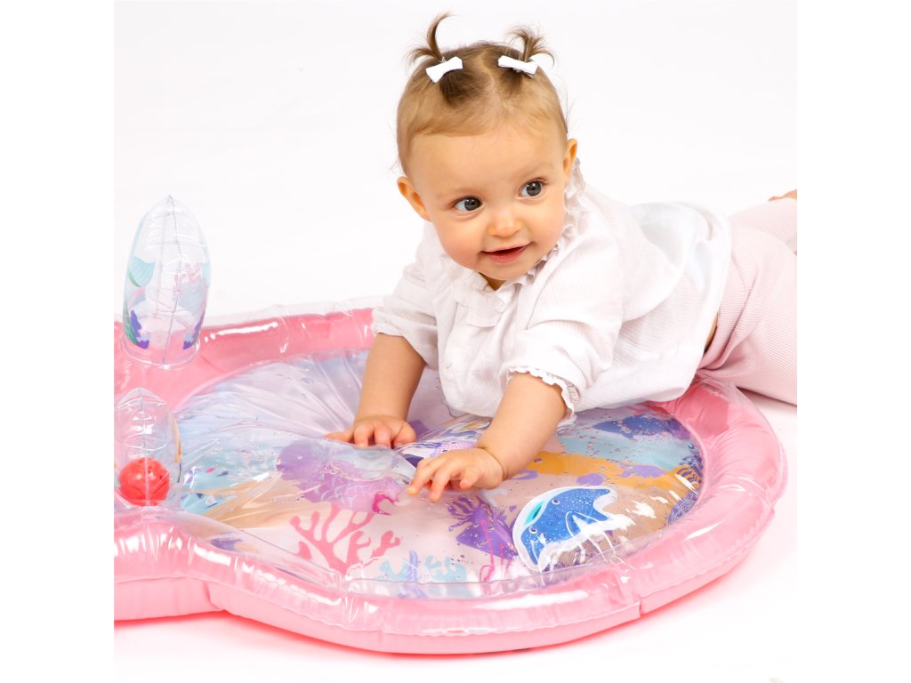 Interaktivní podložka na hraní naplněná vodou připomíná skutečný podmořský svět s vodními živočichy. Figurky mořských tvorů se uvnitř ve vodě začnou pohybovat, kdykoli dítě na podložku sáhne rukou. Jednotlivé části podložky jsou propojené, takže když se dítě o podložku opře, voda proudí mezi jednotlivými částmi. Na nafukovacích okrajích jsou umístěna dvě nafukovací madla, která při zmáčknutí pískají a cinkají.