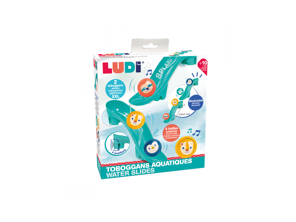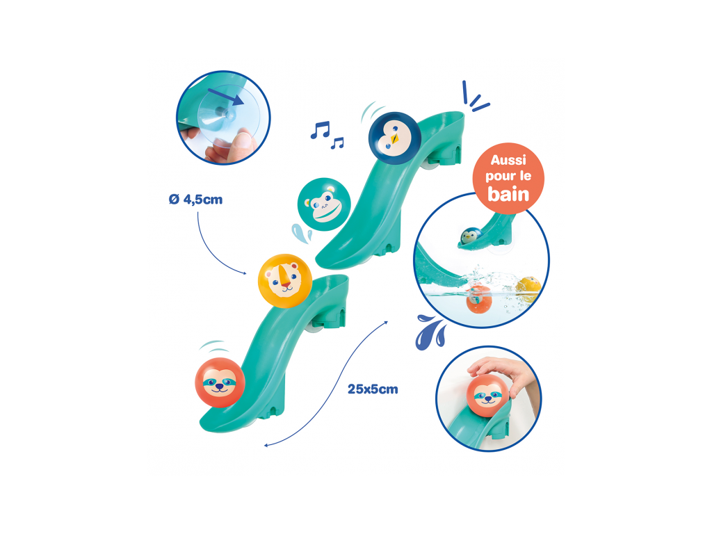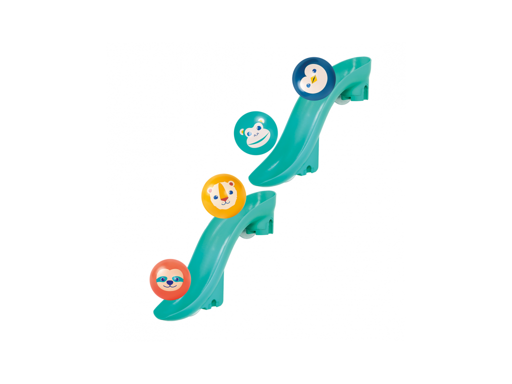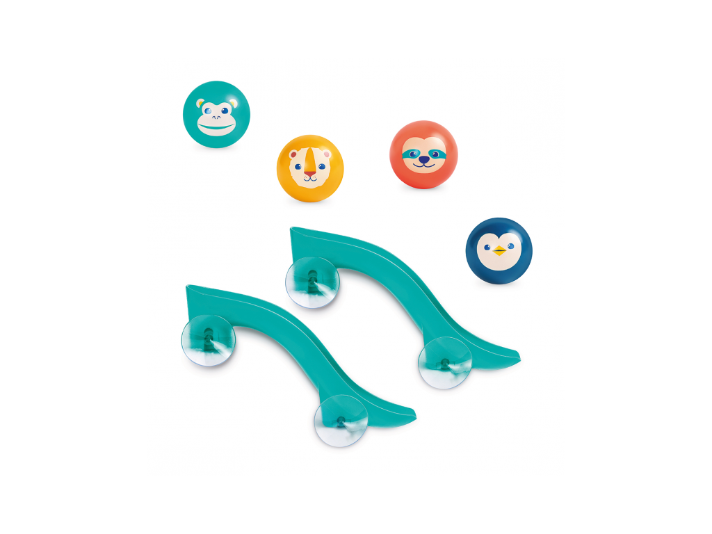 Tobogány s míčky do vany promění každé koupání v zábavnou vodní dráhu, kterou si dítě může samo sestavit a měnit. Díky silným přísavkám se jednotlivé díly snadno upevní na hladké povrchy (obklady, vanu) a drží stabilně i během hry. Dítě pozoruje, jak se míčky pohybují po dráze, zkouší různé varianty a postupně chápe princip příčina–následek. Čtyři plovoucí míčky s rolničkou při jízdě po skluzavce jemně cinkají a podněcují další objevování.