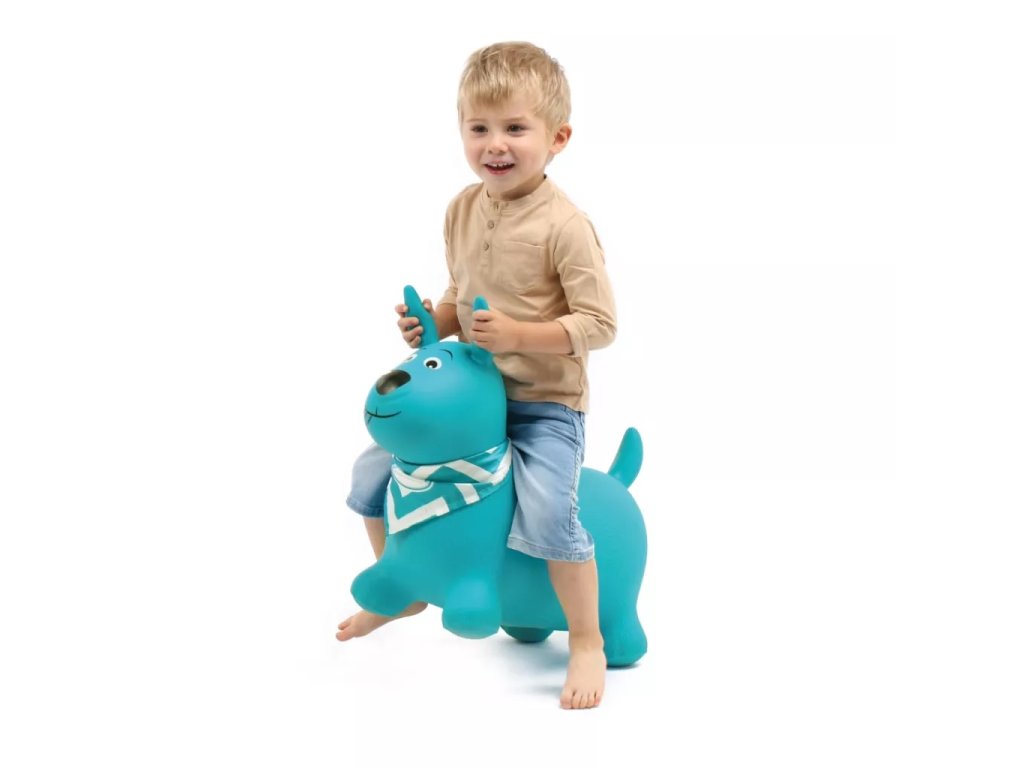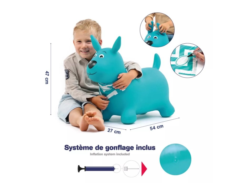 Nafukovací skákací pes pro děti ergonomického tvaru. Nejmenším dětem pomůže při jejich prvních krůčcích. Když dítě získá při chůzi jistotu, začne objevovat kouzlo skákání. Uši slouží jako držadla. Kolem krku můžete pejskovi uvázat šátek s popisovací jmenovkou, aby si dítě svého pejska mohlo pojmenovat.