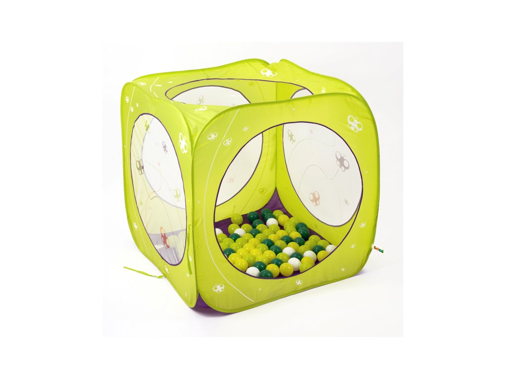 Skládací stan / ohrádka Ludi včetně 85 ks míčků. S kulatým vstupním otvorem a 3 síťovanými kulatými okny pro dobrou cirkulaci vzduchu. Pro použití doma i venku. Rozměry: 90×90×90 cm. Stan je snadné složit do přiložené textilní tašky rozměru 40×43 cm. Vhodné od 10 měsíců.