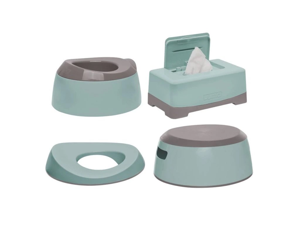 Čtyřdílná tréningová sada na toaletu Luma obsahuje nočník, dětské sedátko na toaletu, protiskluzové stupátko a box na vlhčené ubrousky. Zvýhodněná cena.