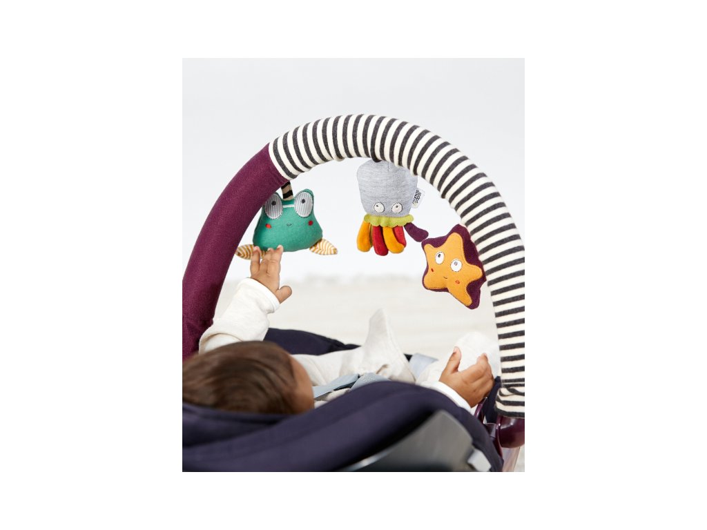 Hrazda se třemi roztomilými hračkami je určena pro připevnění na autosedačku nebo kočárek. Hračky ve tvaru chobotničky, žabáka a hvězdičky chrastí, cinkají a šustí a podněcují tak dítě k jejich zkoumání. Hračky zabaví dítě na cestách a současně podporují rozvoj jeho smyslů.