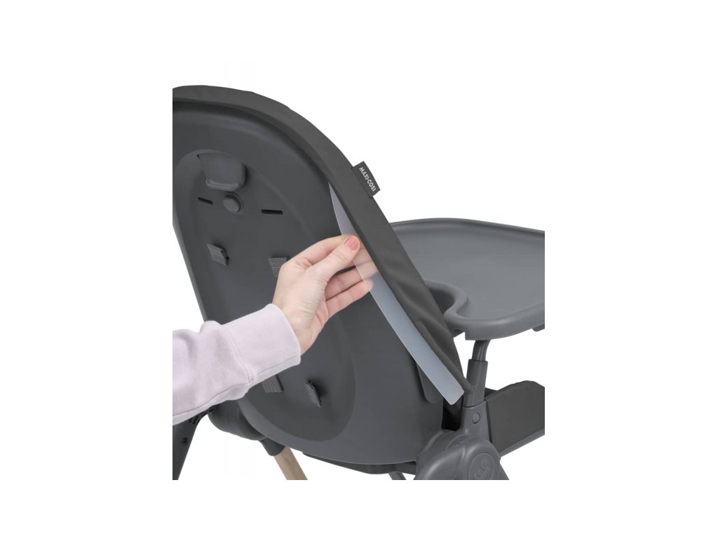 Měkce polstrovaná sedací podložka s nastavitelnými 5-bodovými bezpečnostními pásy a opěrka nohou poskytují dítěti pohodlné sezení. Jídelní pult nabízí tři pozice dle velikosti dítěte a když jej nepoužíváte, můžete jej zavěsit na zadní stranu židličky.