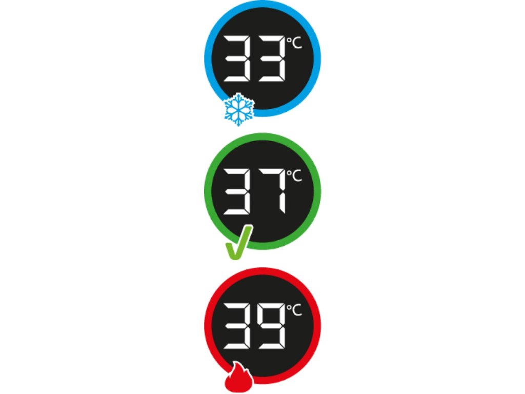 - zelená = ideální 35–38 °C
