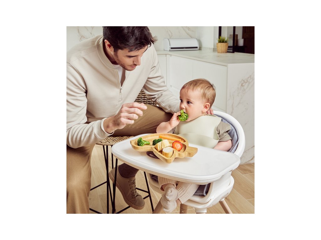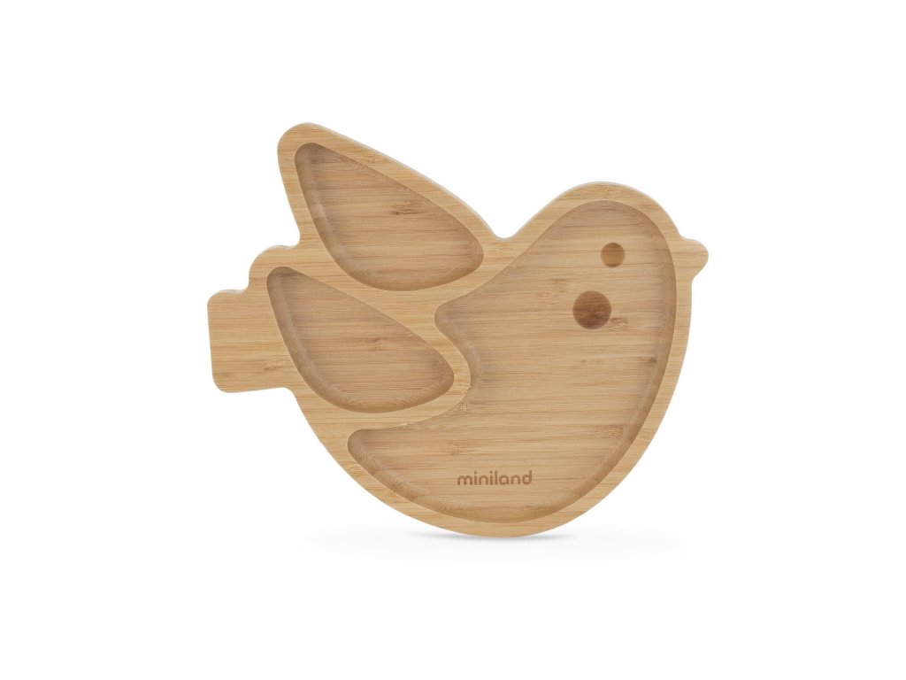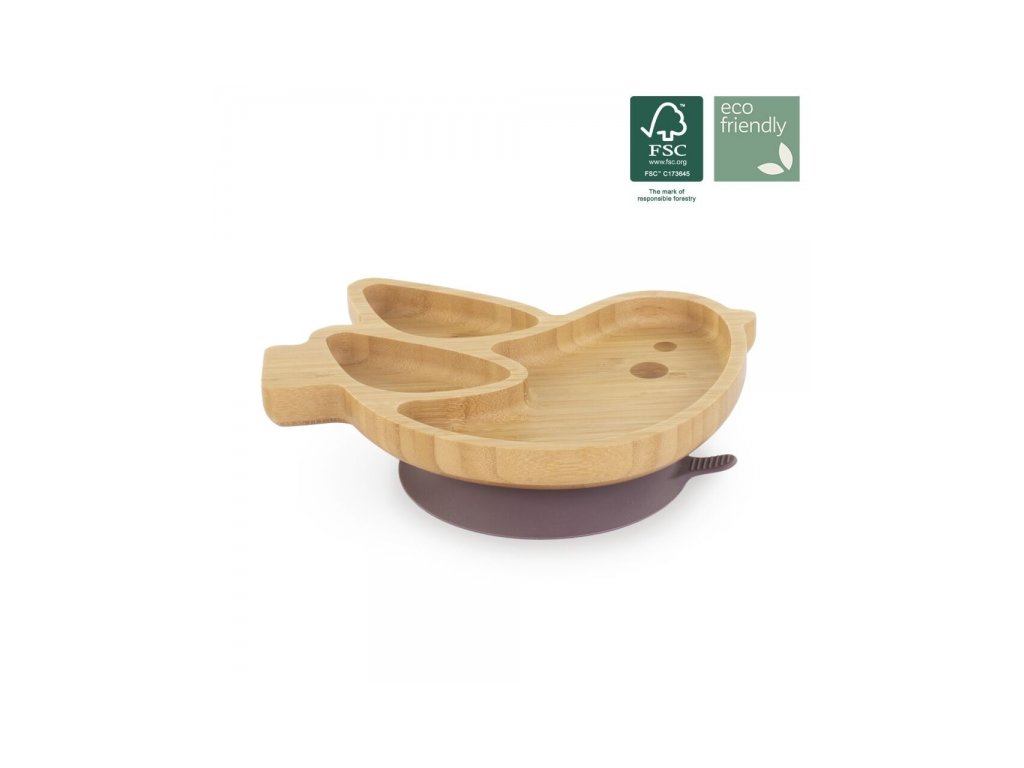 Dělený talíř v krásném provedení z bambusového dřeva ve tvaru ptáčka je vybaven odnímatelnou silikonou přísavkou, díky které neklouže po stole či jídelním pultu židličky. Talíř se třemi přihrádkami je ideální i pro BLW metodu, při které se strava nemixuje a dítě se krmí samo.