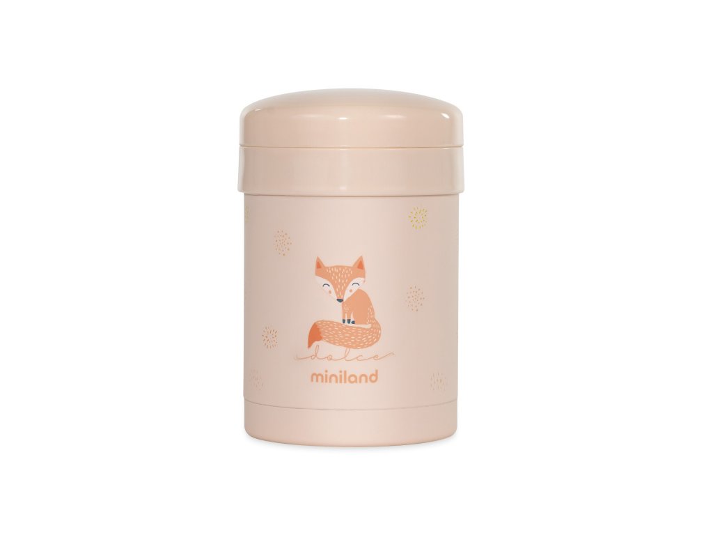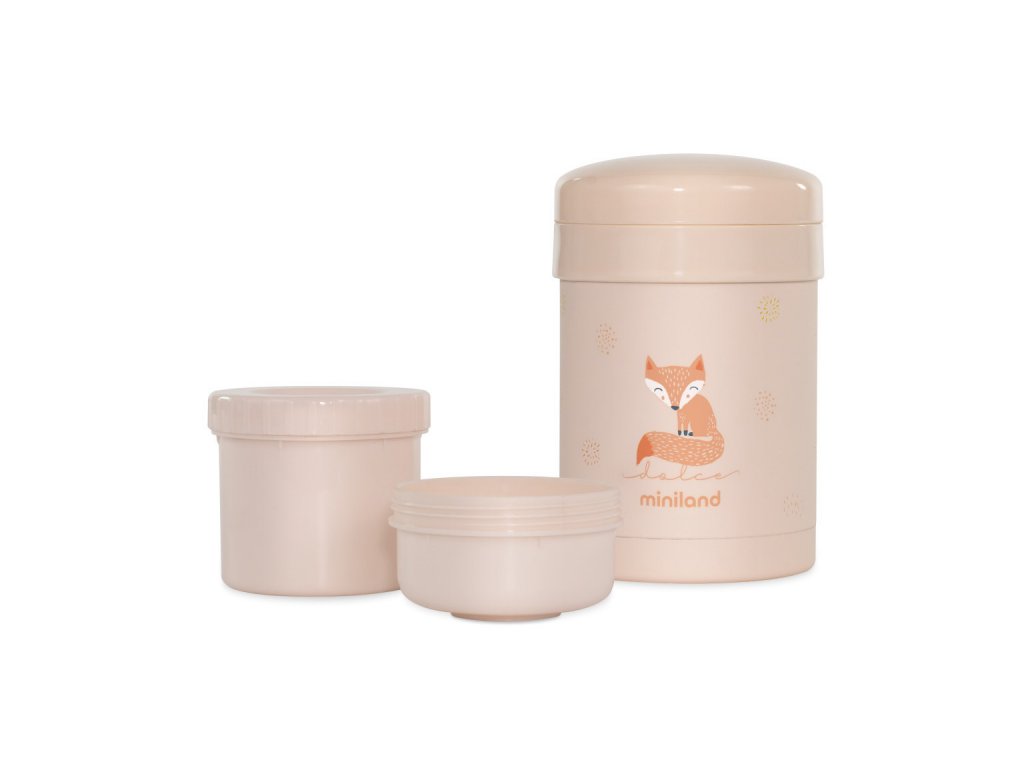 Vakuová termoska Miniland je vyrobena z vysoce kvalitní dvoustěnné oceli a díky tomu udrží několik hodin požadovanou teplotu dětského příkrmu.