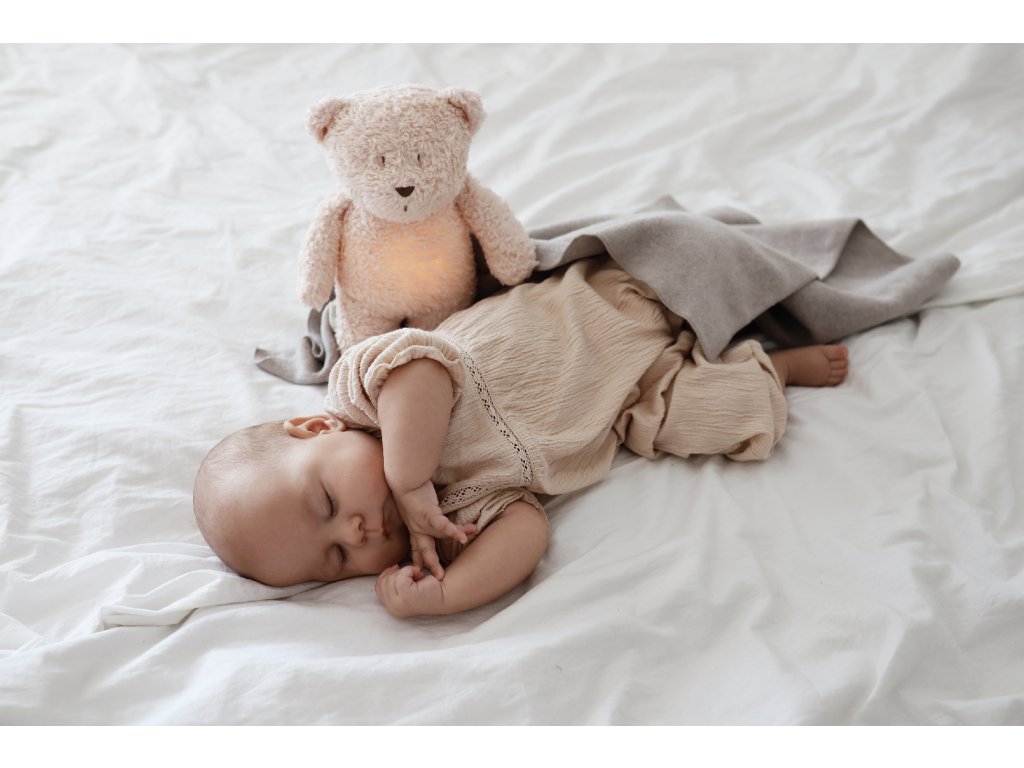 Bříško medvídka svítí a slouží jako noční světlo s výběrem sedmi barev svícení. Jemné světlo pomáhá dítěti cítit se v postýlce bezpečně. Světlo je možné zapnout i bez zvuků. Při zapnuté funkci Shake světlo zapnete zatřesením hračkou. Medvídek se při svícení nijak nezahřívá a je pro dítě zcela bezpečný.