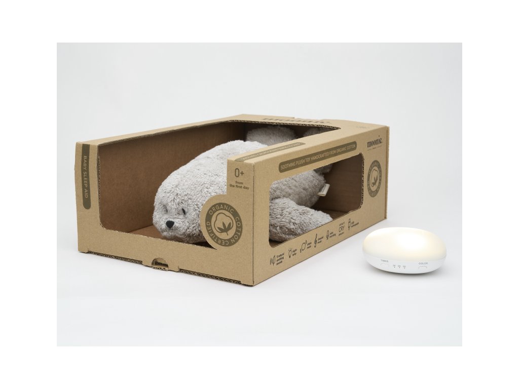Moonie usínáček v podobě roztomilého tuleně s nočním světlem a relaxačními zvuky pomáhá miminku uklidnit se a snáze usnout. Uklidňující zvuky připomínají dítěti prostředí v děloze maminky před jeho narozením.