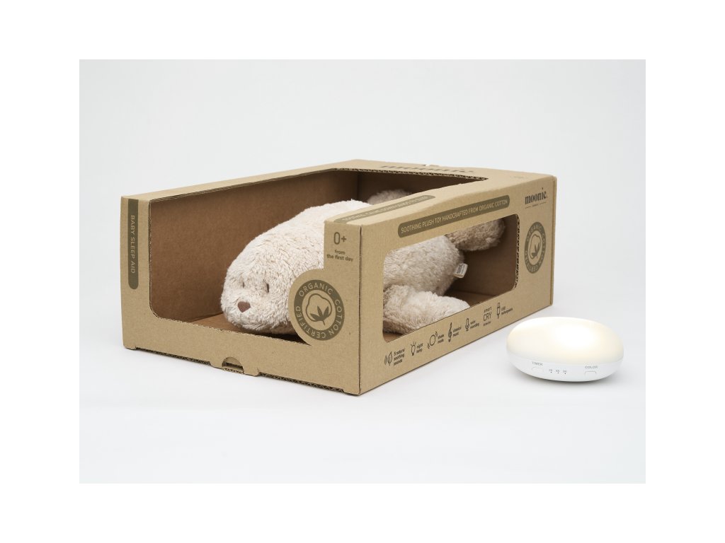 Moonie usínáček v podobě roztomilého tuleně s nočním světlem a relaxačními zvuky pomáhá miminku uklidnit se a snáze usnout. Uklidňující zvuky připomínají dítěti prostředí v děloze maminky před jeho narozením.
