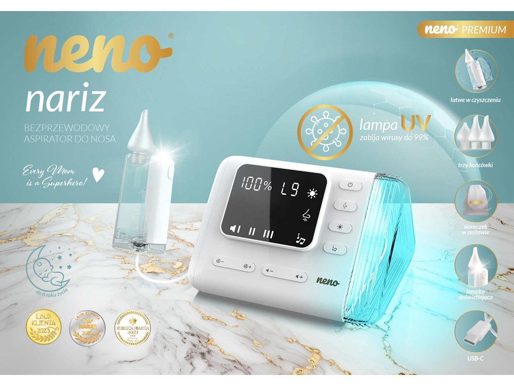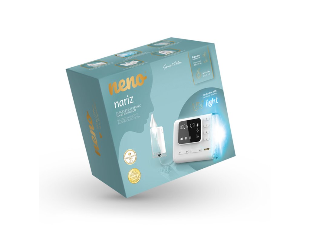 Neno Nariz – bezkabelový odsavač hlenů s UV sterilizací pro děti od narození až do 6 let. Profesionální pomocník pro čistý nos a volné dýchání. Šetrně a efektivně odstraňuje hleny, podporuje klidný spánek a usnadňuje každodenní fungování celé rodiny.