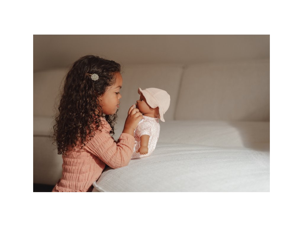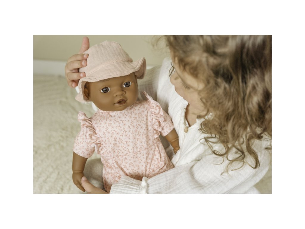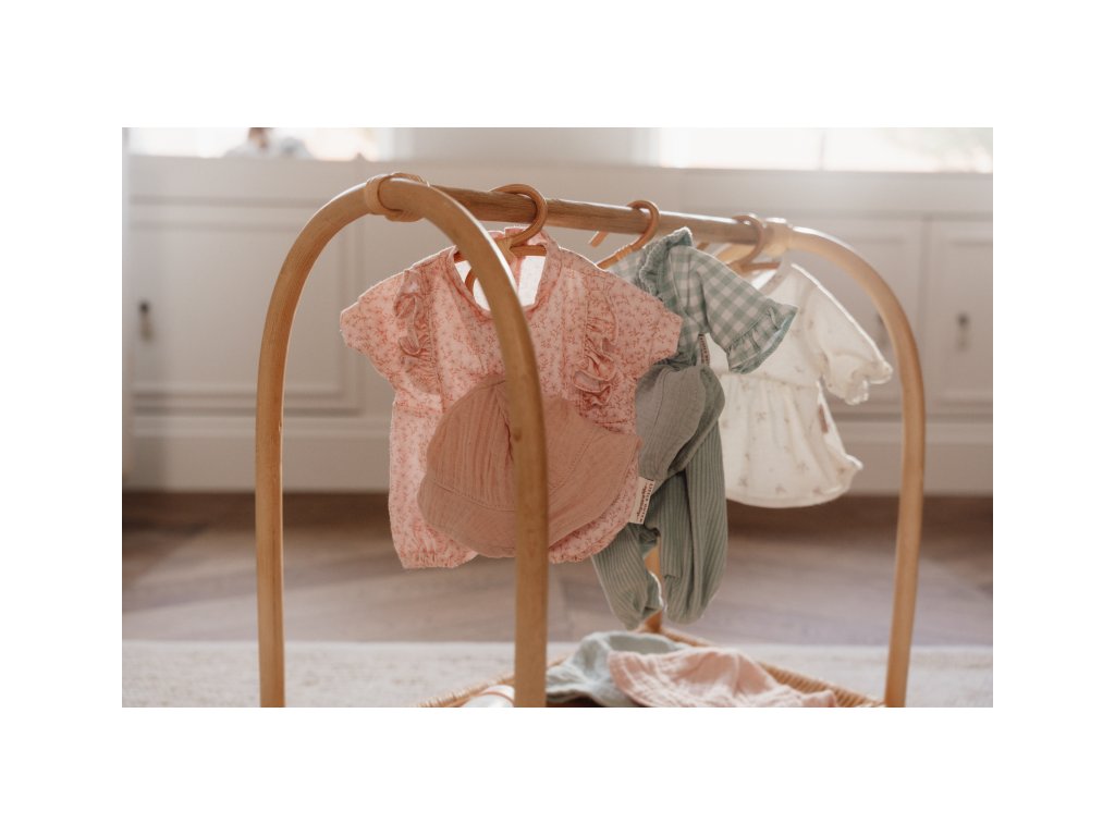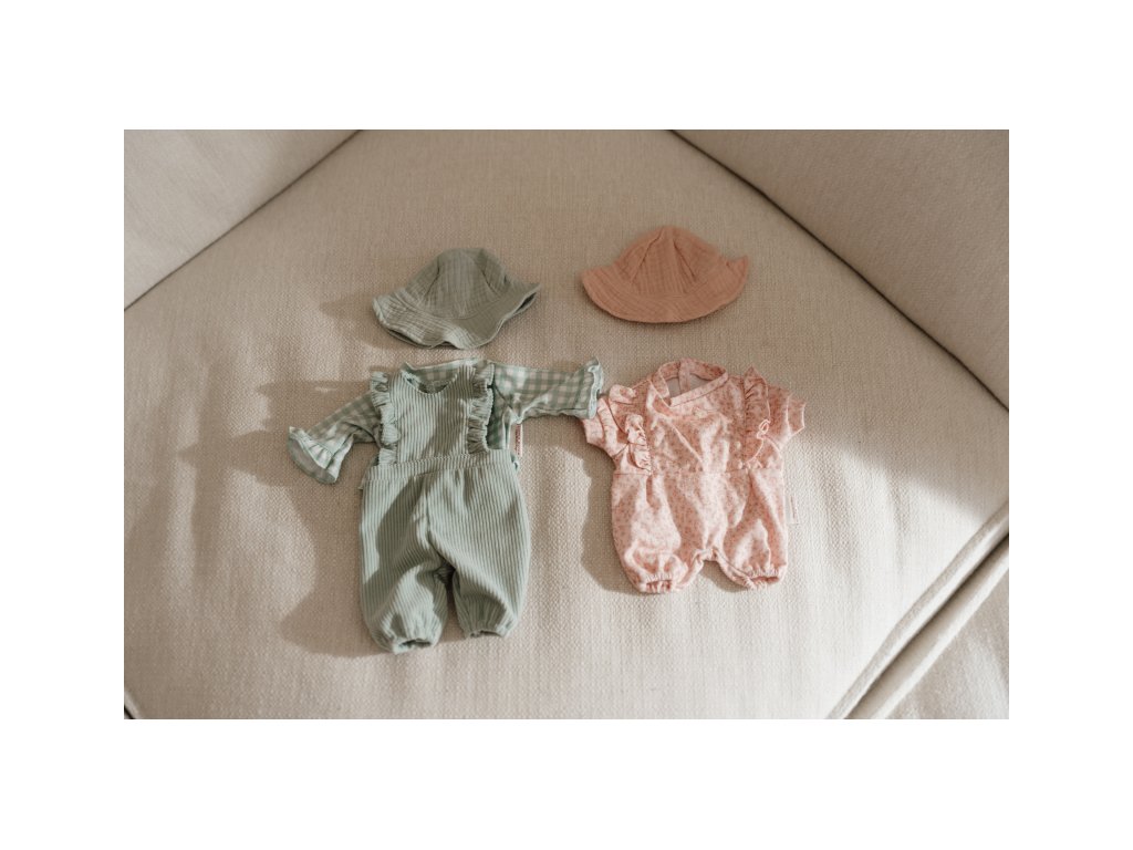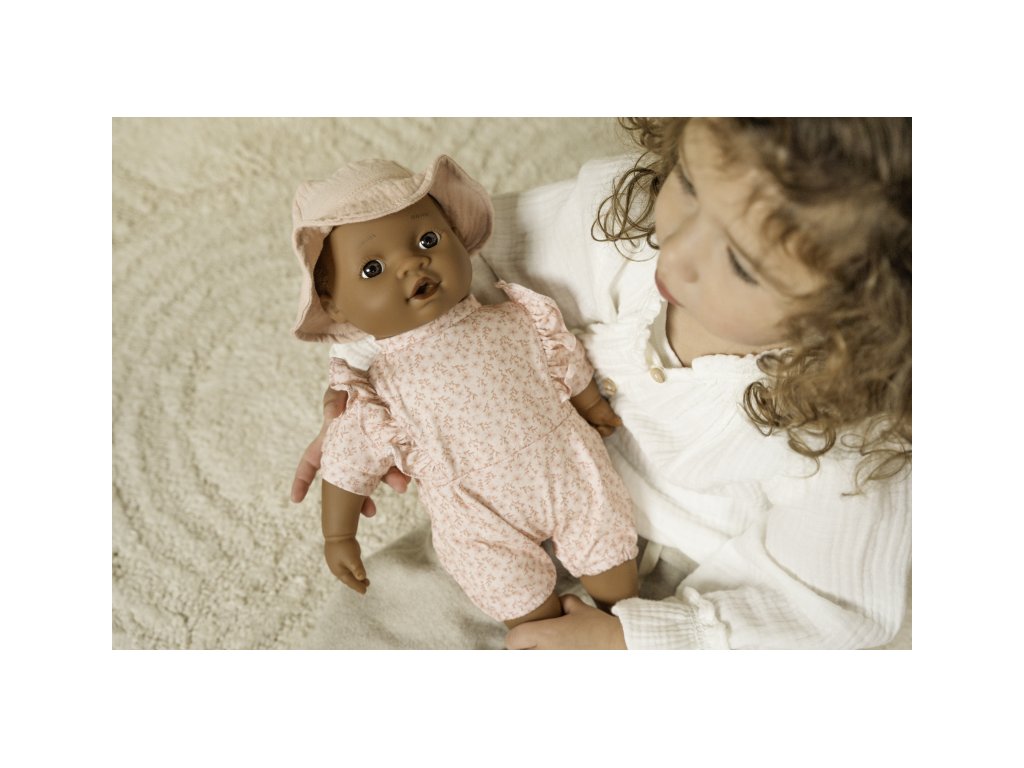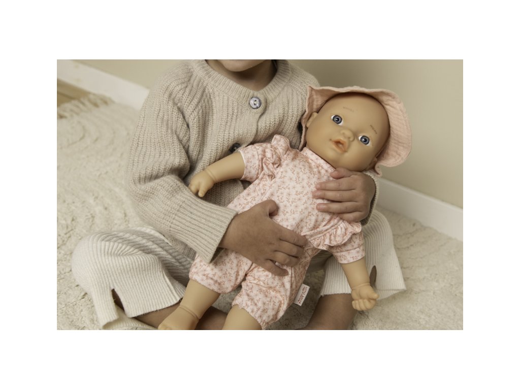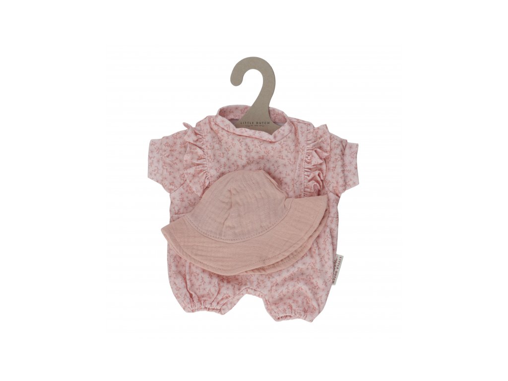Krásná sada oblečení s něžným květinovým potiskem pro panenku Little Dutch Baby obsahuje overal s krátkými nohavicemi a klobouček. Vhodné pro děti od 18 měsíců.