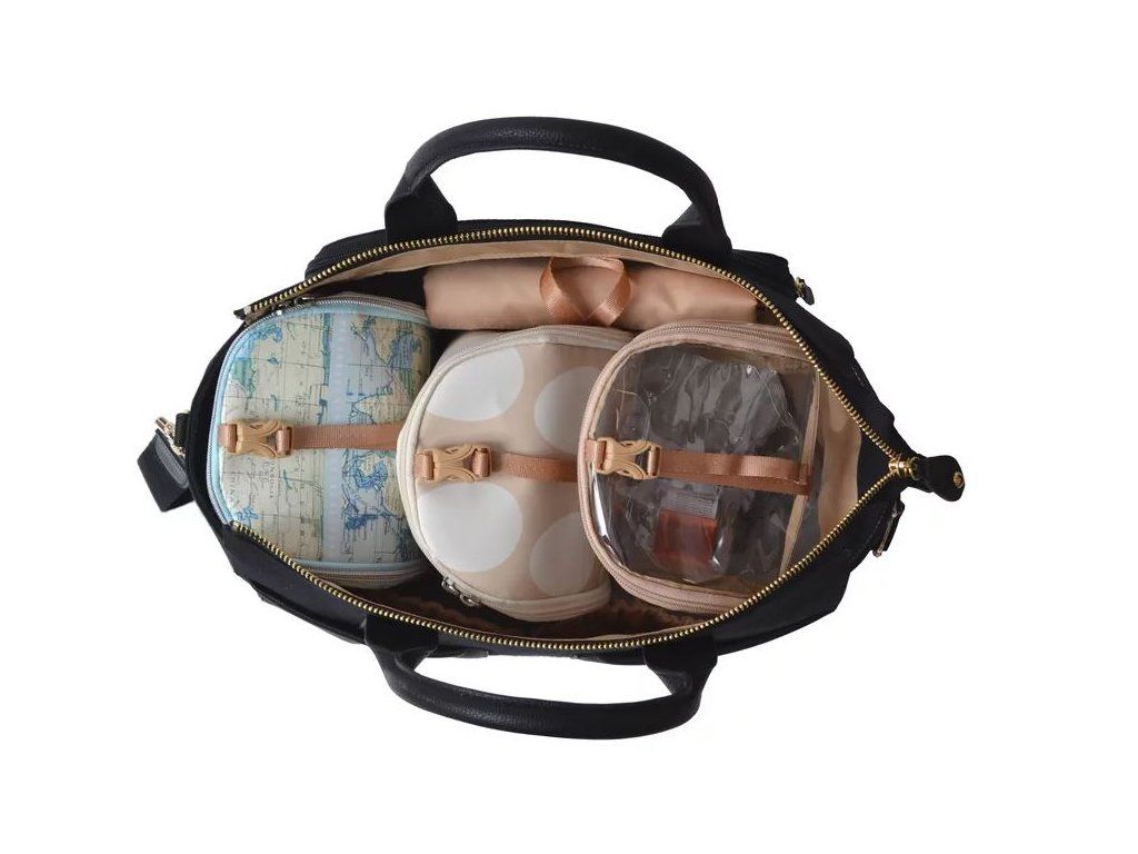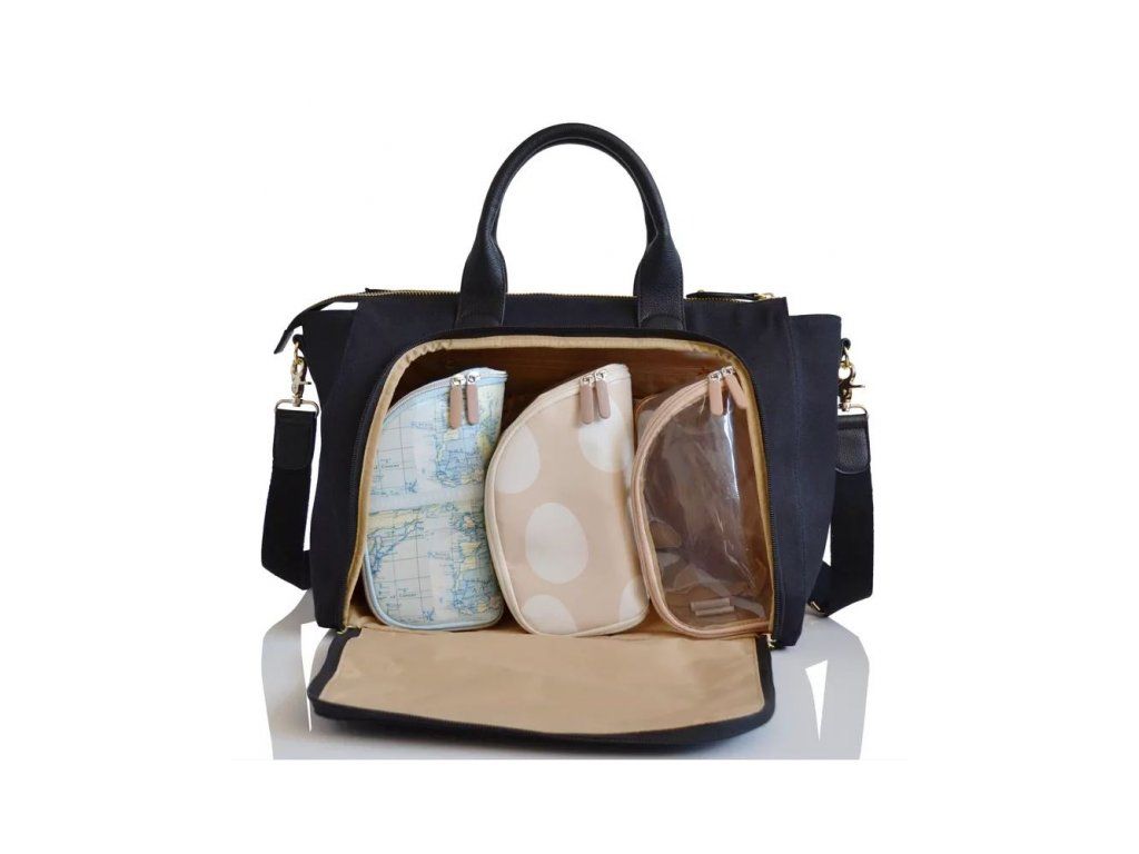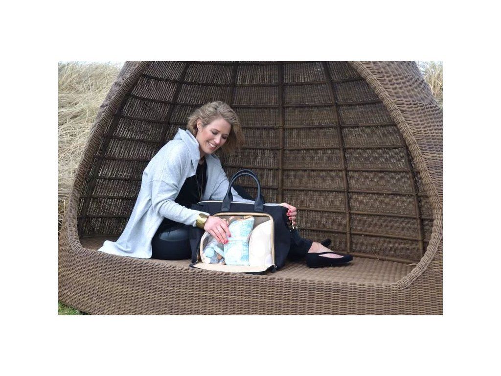Koženkové doplňky a zlatavé kování dodávají této kabelce i přebalovací tašce nadčasový vzhled. Součástí této tašky jsou i 3 vnitřní miniorganizéry....