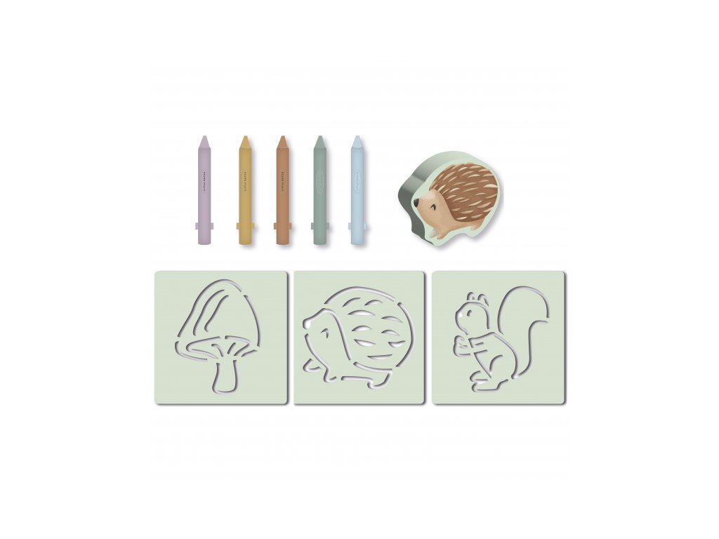 Obsah balení: 5 pastelek, 3 šablony, houbička