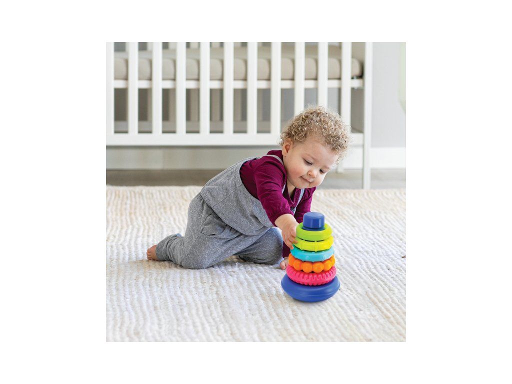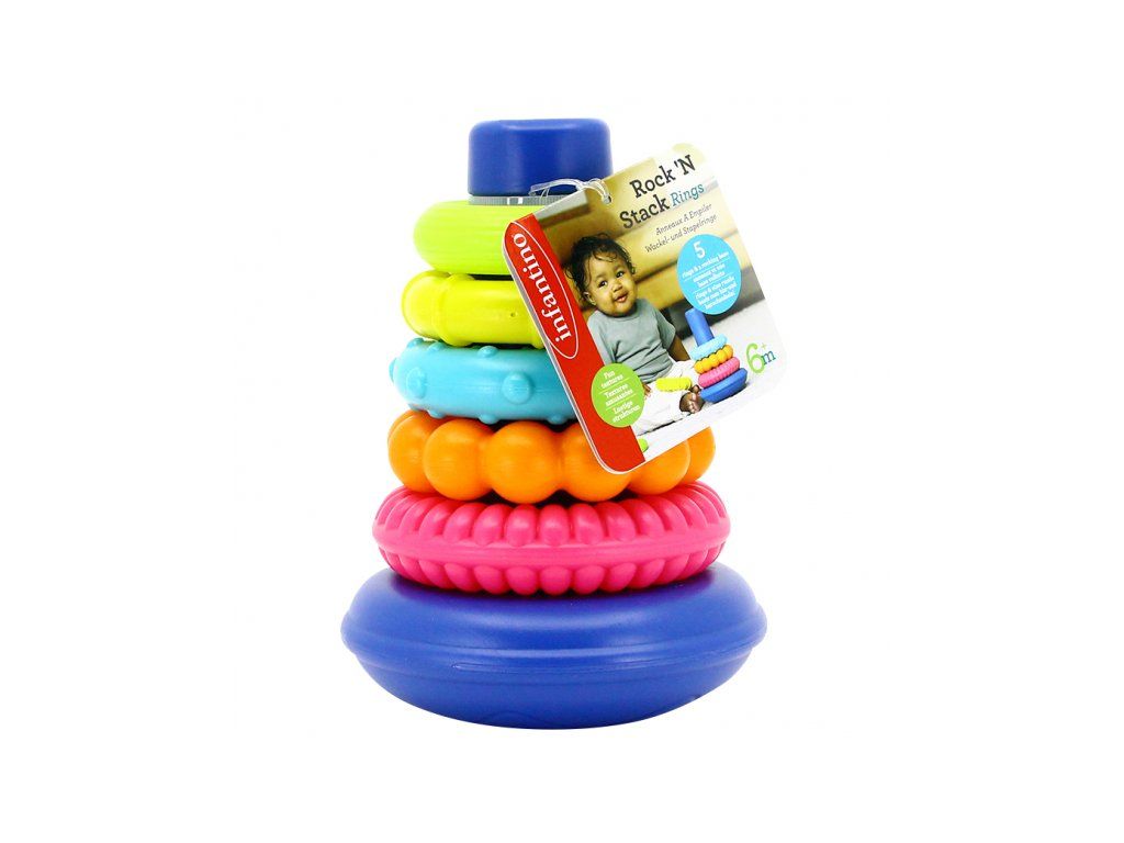 Díky kulaté základně se hračka kýve do všech stran a nasazení kroužků bude pro dítě docela výzva!