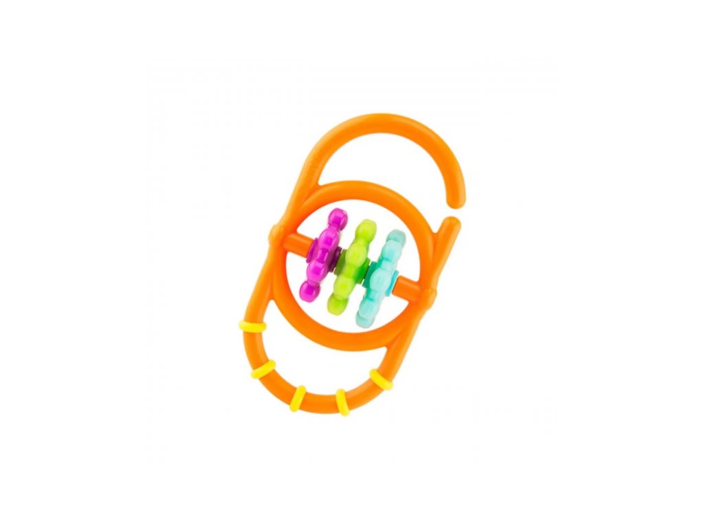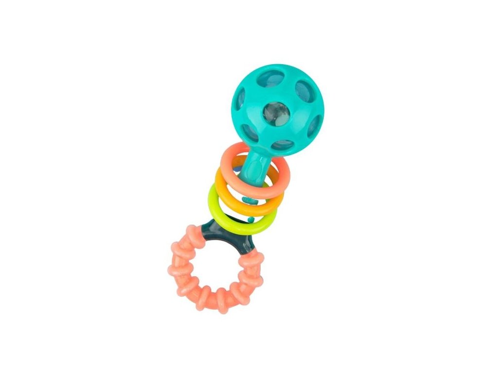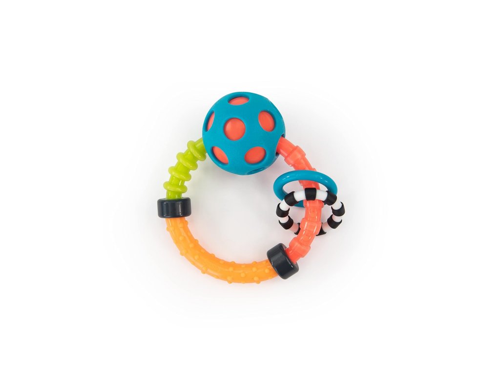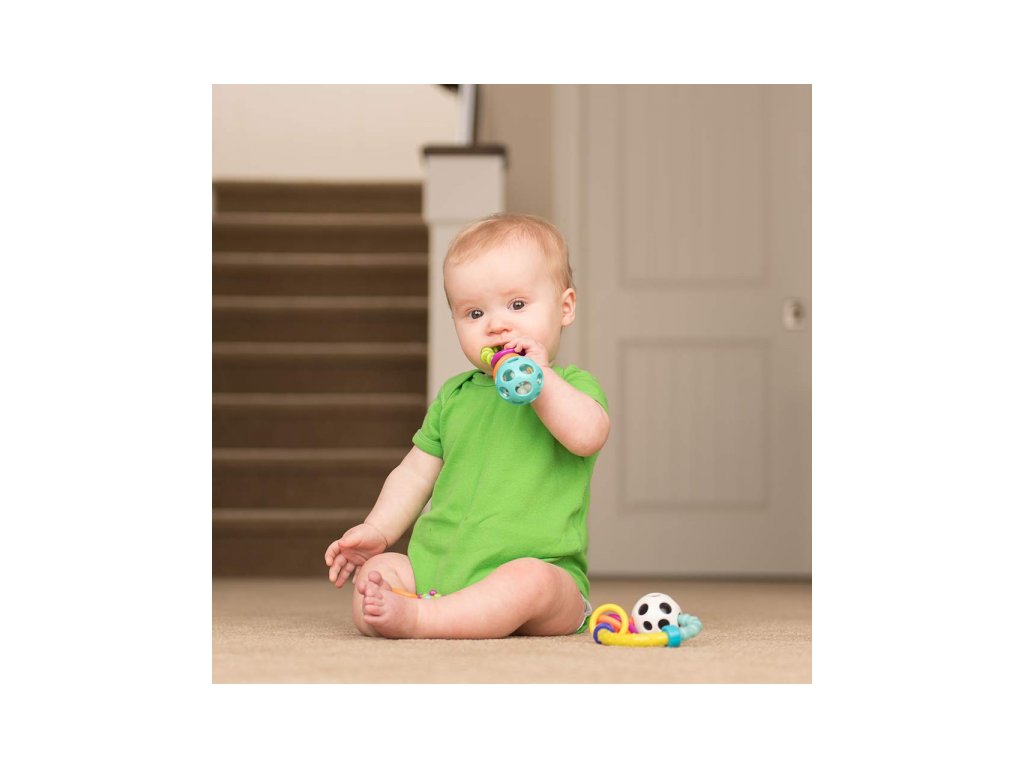 Korálky uvnitř míčků a kroužky na rukojetích při pohybu chrastí a lákají dítě ke zkoumání rukama i ústy.