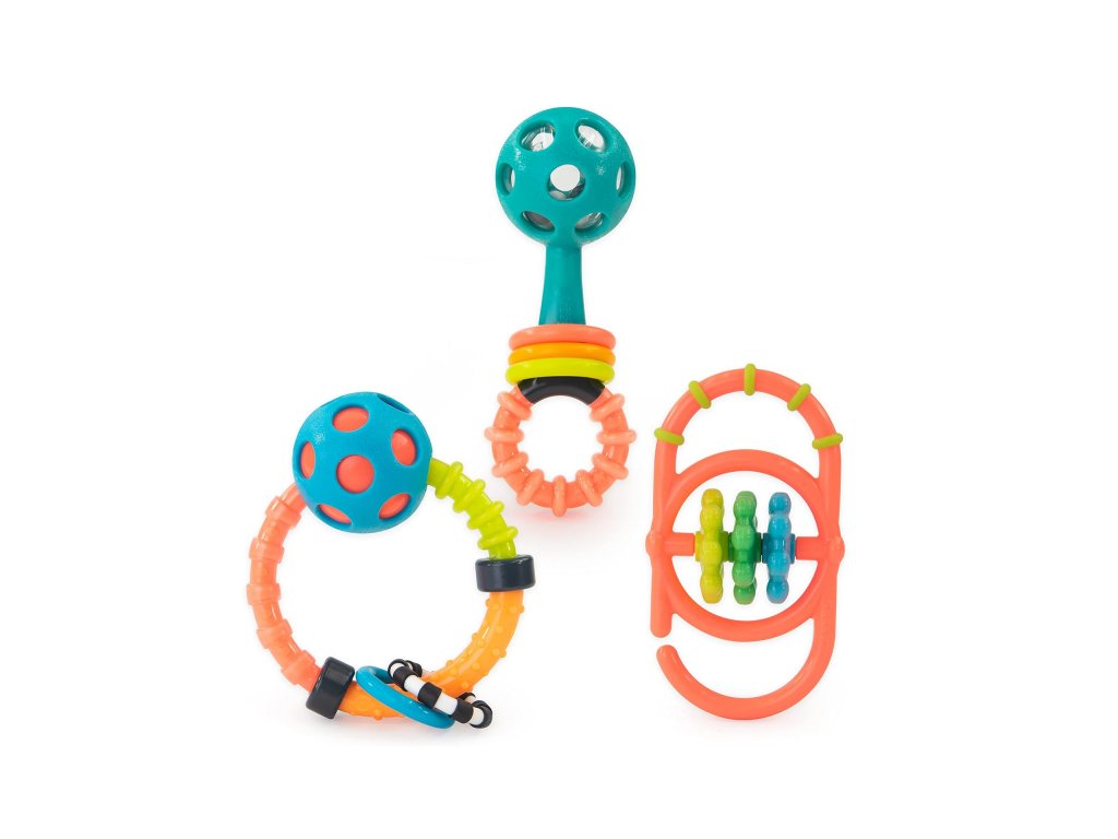 Sada chrastítek v kontrastních barvách z příjemného materiálu a s tvarem pro snadné uchopení.